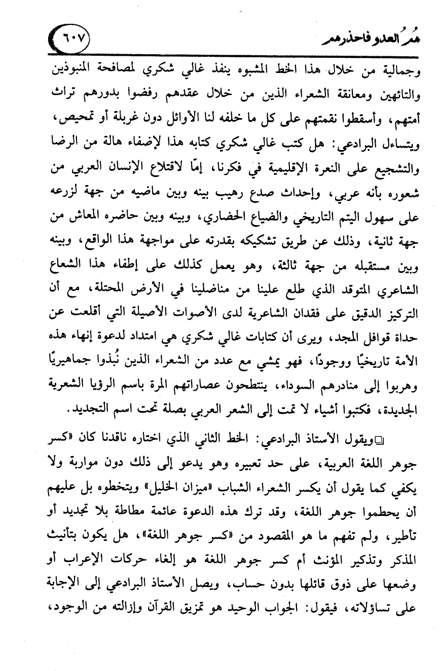 وجمالية من خلال هذا الخط المشبوه ينفذ غالي شكري لمصافحة المنبوذين والتائهين ومعانقة الشعراء الذين من خلال عقدهم رفضوا بدورهم تراث أمتهم، وأسقطوا نقمتهم على كل ما خلفه لنا الأوائل دون غربلة أو تمحيص، ويتساءل البرادعي: هل كتب غالي شكري كتابه هذا لإضفاء هالة من الرضا والتشجيع على النعرة الإقليمية في فكرنا، إمّا لاقتلاع الإنسان العربي من شعوره بأنه عربي، وإحداث صدع رهيب بينه وبين ماضيه من جهة لزرعه على سهول اليتم التاريخي والضياع الحضاري، وبينه وبين حاضره المعاش من جهة ثانية، وذلك عن طريق تشكيكه بقدرته على مواجهة هذا الواقع، وبينه وبين مستقبله من جهة ثالثة، وهو يعمل كذلك على إطفاء هذا الشعاع الشاعري المتوقد الذي طلع علينا من مناضلينا في الأرض المحتلة، مع أن التركيز الدقيق على فقدان الشاعرية لدى الأصوات الأصيلة التي أقلعت عن حداة قوافل المجد، ويرى أن كتابات غالي شكري هي امتداد لدعوة إنهاء هذه الأمة تاريخيًا ووجودًا، فهو يمشي مع عدد من الشعراء الذين نُبذوا جماهيريًا وهربوا إلى منادرهم السوداء، ينتطحون عصاراتهم المرة باسم الرؤيا الشعرية الجديدة، فكتبوا أشياء لا تمت إلى الشعر العربي بصلة تحت اسم التجديد.