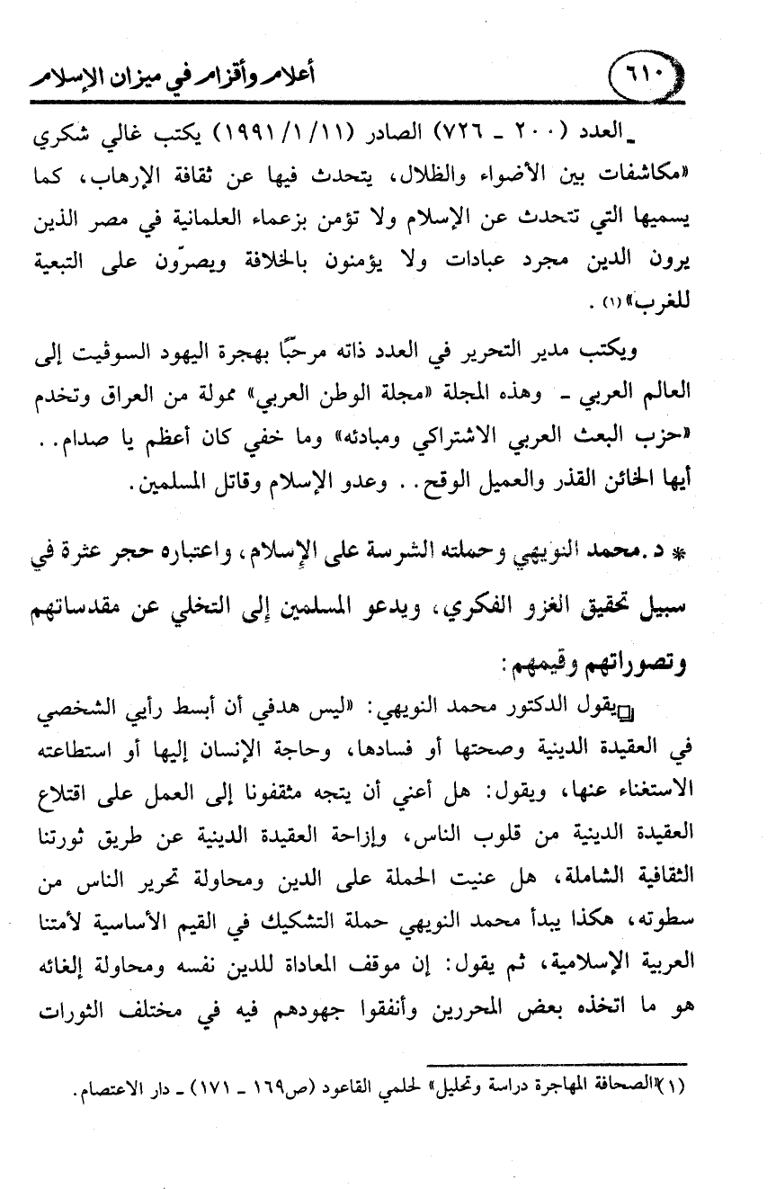 * د. محمد النويهي، حملته الشرسة على الإسلام، واعتباره حجر عثرة في سبيل تحقيق الغزو الفكري، ويدعو المسلمين إِلى التخلي عن مقدساتهم وتصوراتهم وقيمهم: