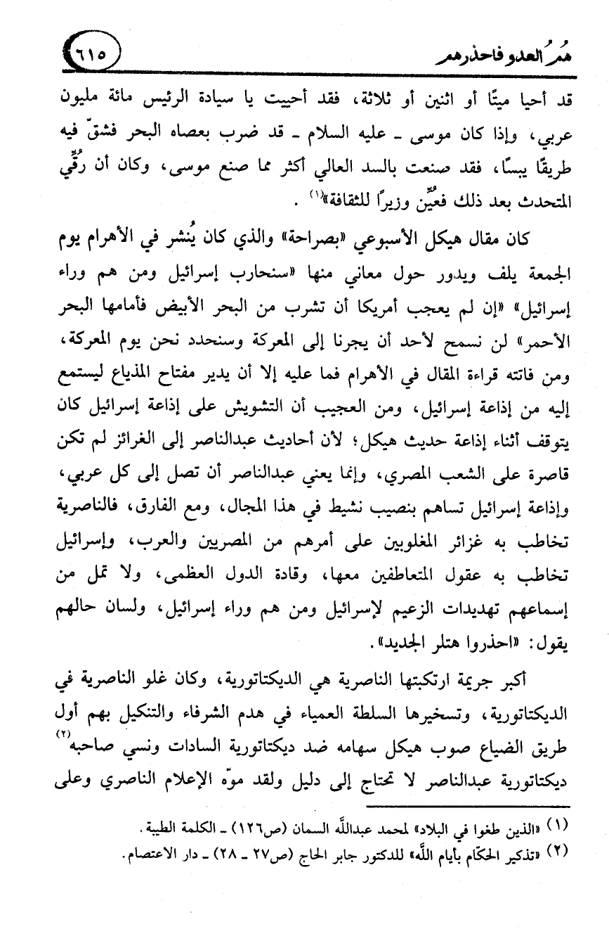 أكبر جريمة ارتكبتها الناصرية هي الديكتاتورية، وكان غلو الناصرية في الديكتاتورية، وتسخيرها السلطة العمياء في هدم الشرفاء والتنكيل بهم أول طريق الضياع صوب هيكل سهامه ضد ديكتاتورية السادات ونسي صاحبه (2) ديكتاتورية عبد الناصر لا تحتاج إلى دليل ولقد موّه الإعلام الناصري وعلى