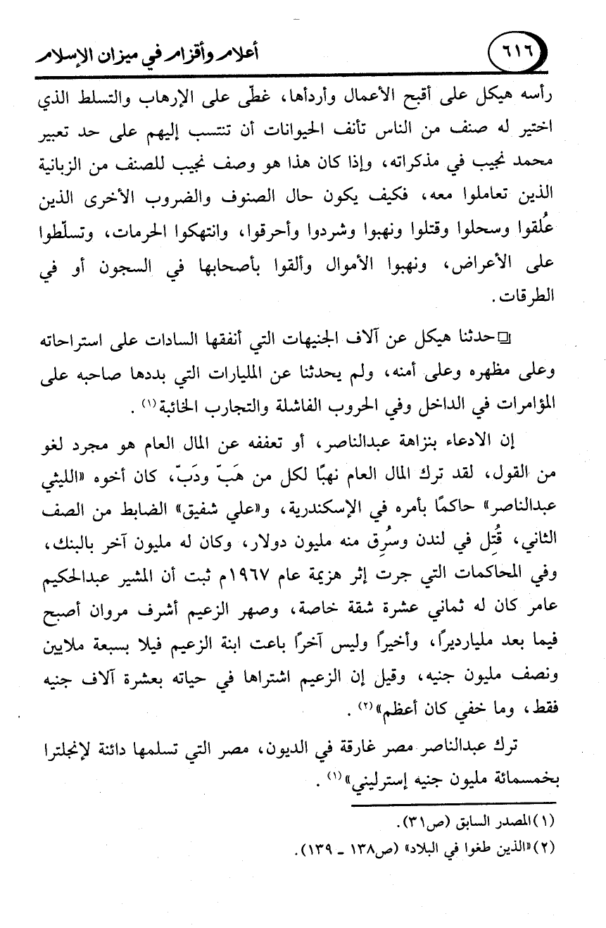- حدثنا هيكل عن آلاف الجنيهات التي أنفقها السادات على استراحاته وعلى مظهره وعلى أمنه، ولم يحدثنا عن المليارات التي بددها صاحبه على المؤامرات في الداخل وفي الحروب الفاشلة والتجارب الخائبة (1).