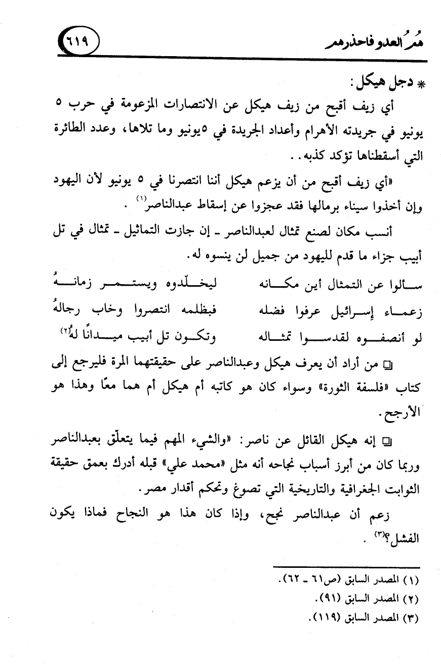 "أي زيف أقبح من أن يزعم هيكل أننا أنتصرنا في 5 يونيو لأن اليهود وإن أخذوا سيناء برمالها فقد عجزوا عن إسقاط عبد الناصر (1).