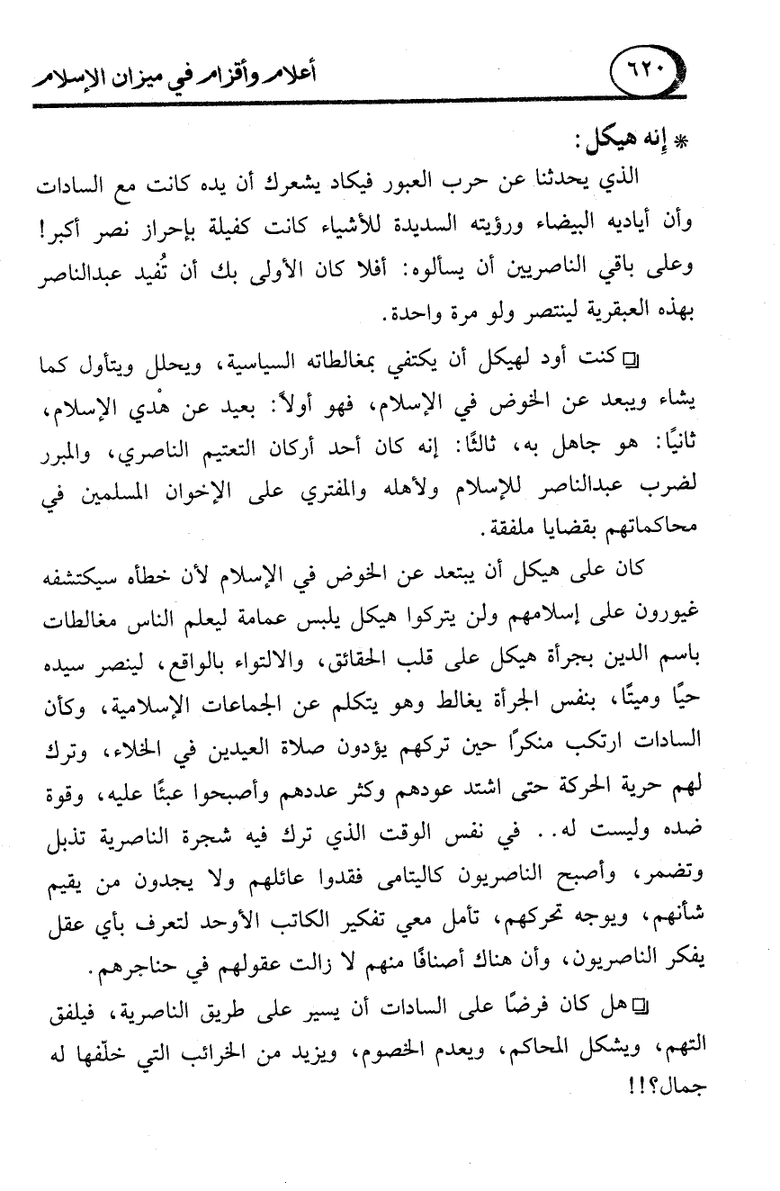- كنت أود لهيكل أن يكتفي بمغالطاته السياسية، ويحلل ويتأول كما يشاء ويبعد عن الخوض في الإسلام، فهو أولاً: بعيد عن هدي الإسلام، ثانيًا: هو جاهل به، ثالثًا: إنه كان أحد أركان التعتيم الناصري، والمبرر لضرب عبد الناصر للإسلام ولأهله والمفتري على الإخوان المسلمين في محاكماتهم بقضايا ملفقة.