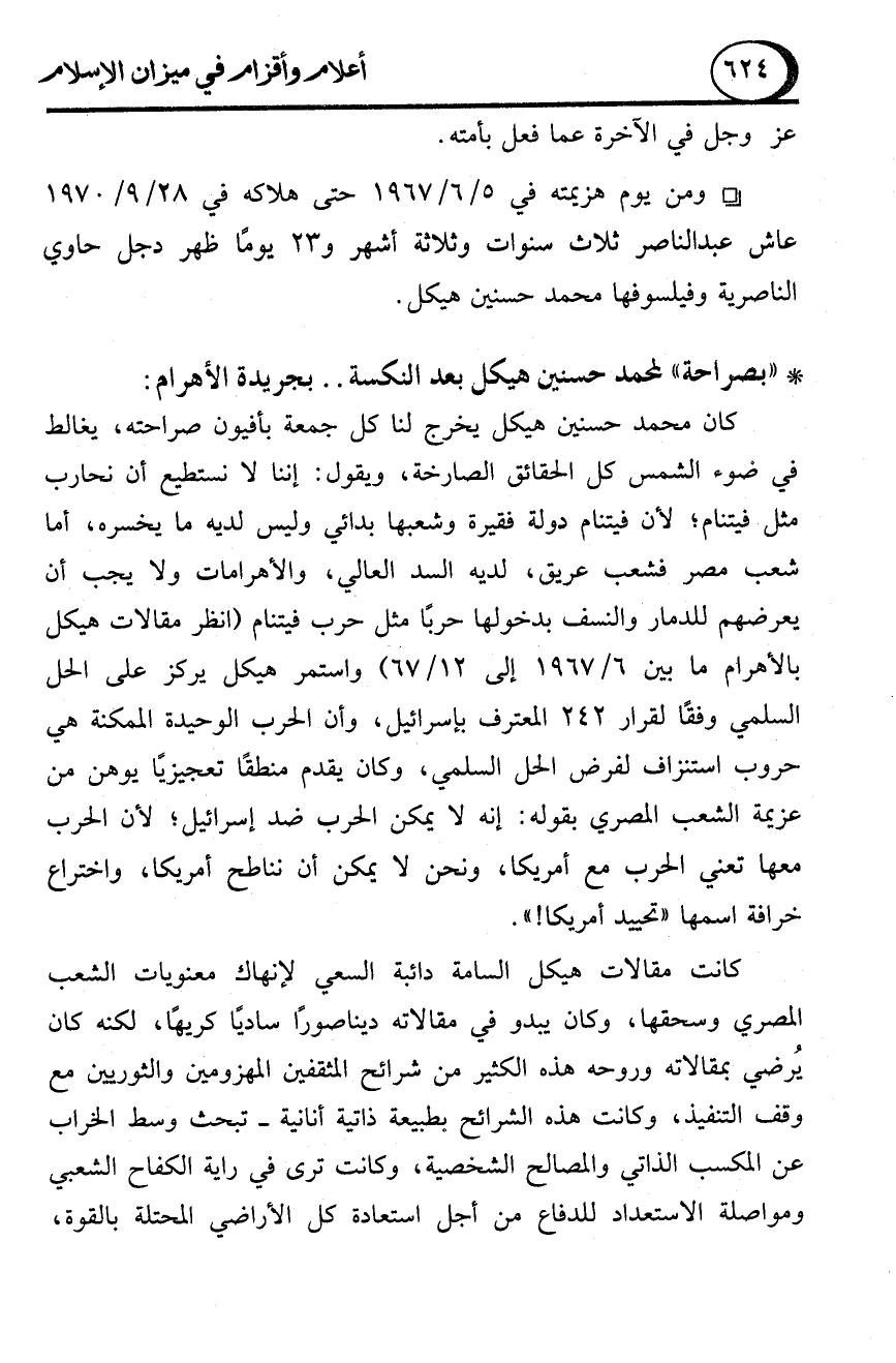 كان محمد حسنين هيكل يخرج لنا كل جمعة بأفيون صراحته، يغالط في ضوء الشمس كل الحقائق الصارخة، ويقول: إننا لا نستطيع أن نحارب مثل فيتنام؛ لأن فيتنام دولة فقيرة وشعبها بدائي وليس لديه ما يخسره، أما شعب مصر فشعب عريق، لديه السد العالي، والأهرامات ولا يجب أن يعرضهم للدمار والنسف بدخولها حربًا مثل حرب فيتنام (انظر مقالات هيكل بالأهرام ما بين 6/ 1967 إلى 12/ 67) واستمر هيكل يركز على الحل السلمي وفقًا لقرار 242 المعترف بإسرائيل، وأن الحرب الوحيدة الممكنة هي حروب استنزاف لفرض الحل السلمي، وكان يقدم منطقًا تعجيزيًا يوهن من عزيمة الشعب المصري بقوله: إنه لا يمكن الحرب ضد إسرائيل؛ لأن الحرب معها تعني الحرب مع أمريكا، ونحن لا يمكن أن نناطح أمريكا، واختراع خرافة اسمها "تحييد أمريكا! ".