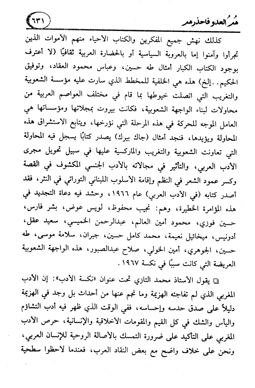 كذلك نهش جميع المفكرين والكتاب الأحياء منهم الأموات الذين تجرأوا وآمنوا إما بالعروبة السياسية أو بالحضارة العربية ثقافيًا (لا أعترف بوجود الكتاب الكبار أمثال طه حسين، وعباس محمود العقاد، وتوفيق الحكيم .. إلخ) هذه هي الخلفية للمخطط الذي سارت عليه مؤسسة الشعوبية والتغريب التي اتصلت خيوطها بما قام في مختلف العواصم العربية من محاولات لبناء الواجهة الشعوبية، فكانت بيروت بمجلاتها ومؤسساتها هي العامل الموجه للحركة في هذه المرحلة التي نؤرخها، ويتابع الاستشراق هذه المحاولة ويؤيدها، فنجد أمثال (جاك بيرك) يصدر كتابًا يسجل فيه المحاولة التي تعاونت الشعوبية والتغريب والماركسية عليها في سبيل تحويل مجرى الأدب العربي، والتأثير في مجالاته بالأدب الجنسي المكشوف في القصة وكسر عمود الشعر في النظم وإقامة الأسلوب اللبناني التوراتي في النثر، فقد أصدر كتابه (في الأدب العربي) عام 1966، وحشد فيه دعاة التجديد في هذه المؤامرة الخطيرة، وهم: نجيب محفوظ، لويس عوض، بشر فارس، حسين فوزي، محمود أمين العالم، عبد الرحمن الخميسي، سعيد عقل، أدونيس، ميخائيل نعيمة، محمد كامل حسين، جبران، سلامة موسى، طه حسين، الجوهري، أمين الخولي، صلاح عبد الصبور، هذه الواجهة الشعوبية العريضة التي كانت سببًا في نكسة 1967.