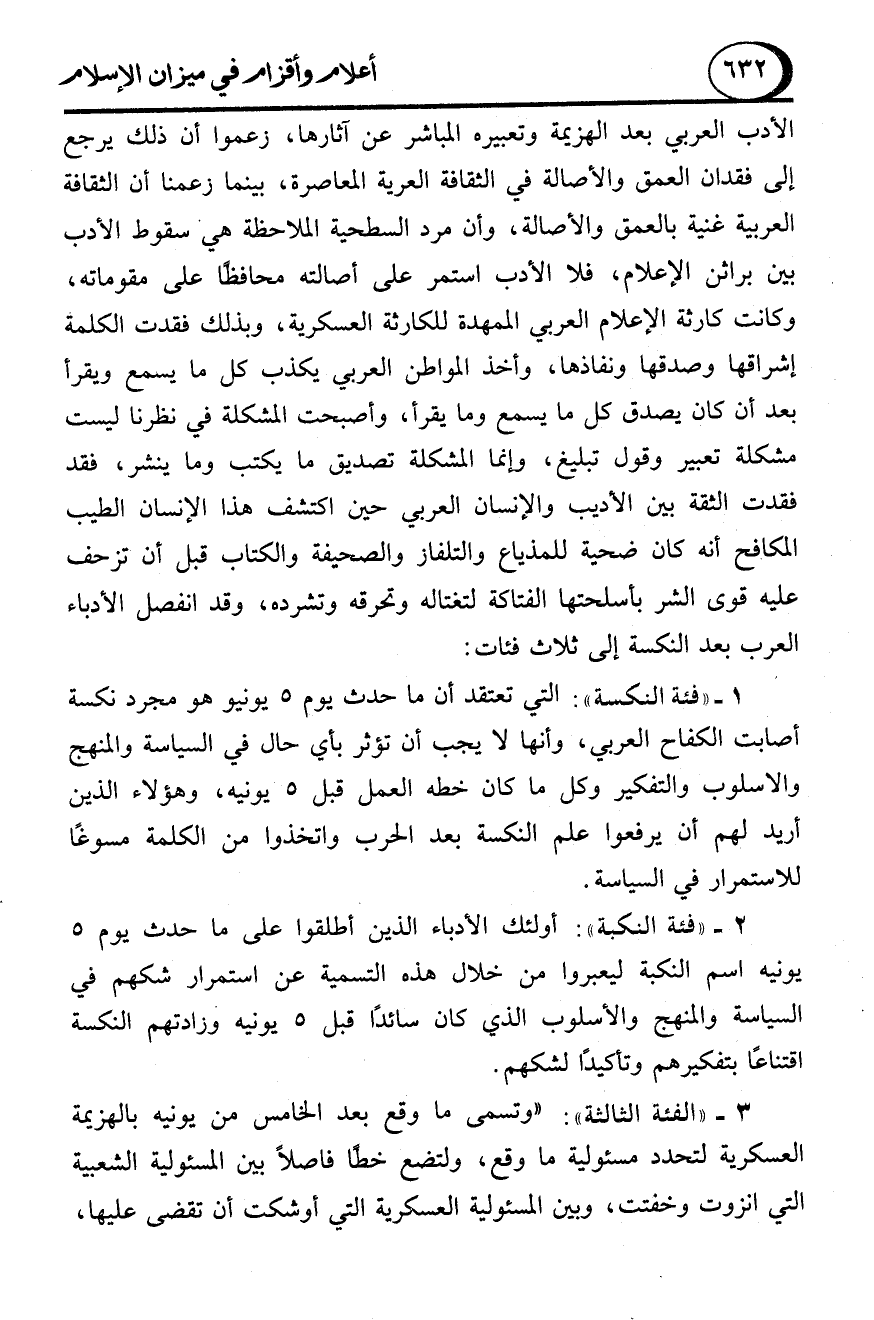 الأدب العربي بعد الهزيمة وتعبيره المباشر عن آثارها، زعموا أن ذلك يرجع إلى فقدان العمق والأصالة في الثقافة العربية المعاصرة، بينما زعمنا أن الثقافة العربية غنية بالعمق والأصالة، وأن مرد السطحية الملاحظة هي سقوط الأدب بين براثن الإعلام، فلا الأدب استمر على أصالته محافظًا على مقوماته، وكانت كارثة الإعلام العربي الممهدة للكارثة العسكرية، وبذلك فقدت الكلمة إشراقها وصدقها ونفاذها، وأخذ المواطن العربي يكذب كل ما يسمع ويقرأ بعد أن كان يصدق كل ما يسمع وما يقرأ، وأصبحت المشكلة في نظرنا ليست مشكلة تعبير وقول تبليغ، وإنما المشكلة تصديق ما يكتب وما ينشر، فقد فقدت الثقة بين الأديب والإنسان العربي حين اكتشف هذا الإنسان الطيب المكافح أنه كان ضحية للمذياع والتلفاز والصحيفة والكتاب قبل أن تزحف عليه قوى الشر بأسلحتها الفتاكة لتغتاله وتحرقه وتشرده، وقد انفصل الأدباء العرب بعد النكسة إلى ثلاث فئات: