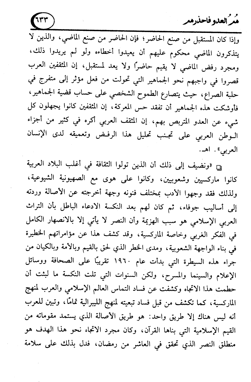 - "ونضيف إلى ذلك أن الذين تولوا الثقافة في أغلب البلاد العربية كانوا ماركسيين وشعوبيين، وكانوا على هوى مع الصهيونية الشيوعية، ولذلك فقد وجهوا الأدب بمختلف فنونه وجهة أخرجته عن الأصالة وردته إلى أساليب جوفاء، ثم كان لهم بعد النكسة الادعاء الباطل بأن التراث العربي الإسلامي هو سبب الهزيمة وأن النصر لا يأتي إلا بالانصهار الكامل في الفكر الغربي وخاصة الماركسية، وقد كشف هذا عن مؤامراتهم الخطيرة في بناء الواجهة الشعوبية، ومدى الخطر الذي لحق بالقيم وبالأمة وبالكيان من جراء هذه السيطرة التي بدأت عام 1960 تقريبًا على الصحافة ووسائل الإعلام والسينما والمسرح، ولكن السنوات التي تلت النكسة ما لبثت أن حطمت هذا الاتجاه وكشفت عن فساد التماس العالم الإسلامي والعرب لمنهج الماركسية، كما تكشف من قبل فساد تبعيته لمنهج الليبرالية تمامًا، وتبين للعرب أنه ليس هناك إلا طريق واحد: هو طريق الأصالة الذي يستمد مقوماته من القيم الإسلامية التي بناها القرآن، وكان مجرد الاتجاه نحو هذا الهدف هو منطلق النصر الذي تحقق في العاشر من رمضان، فدل بذلك على سلامة