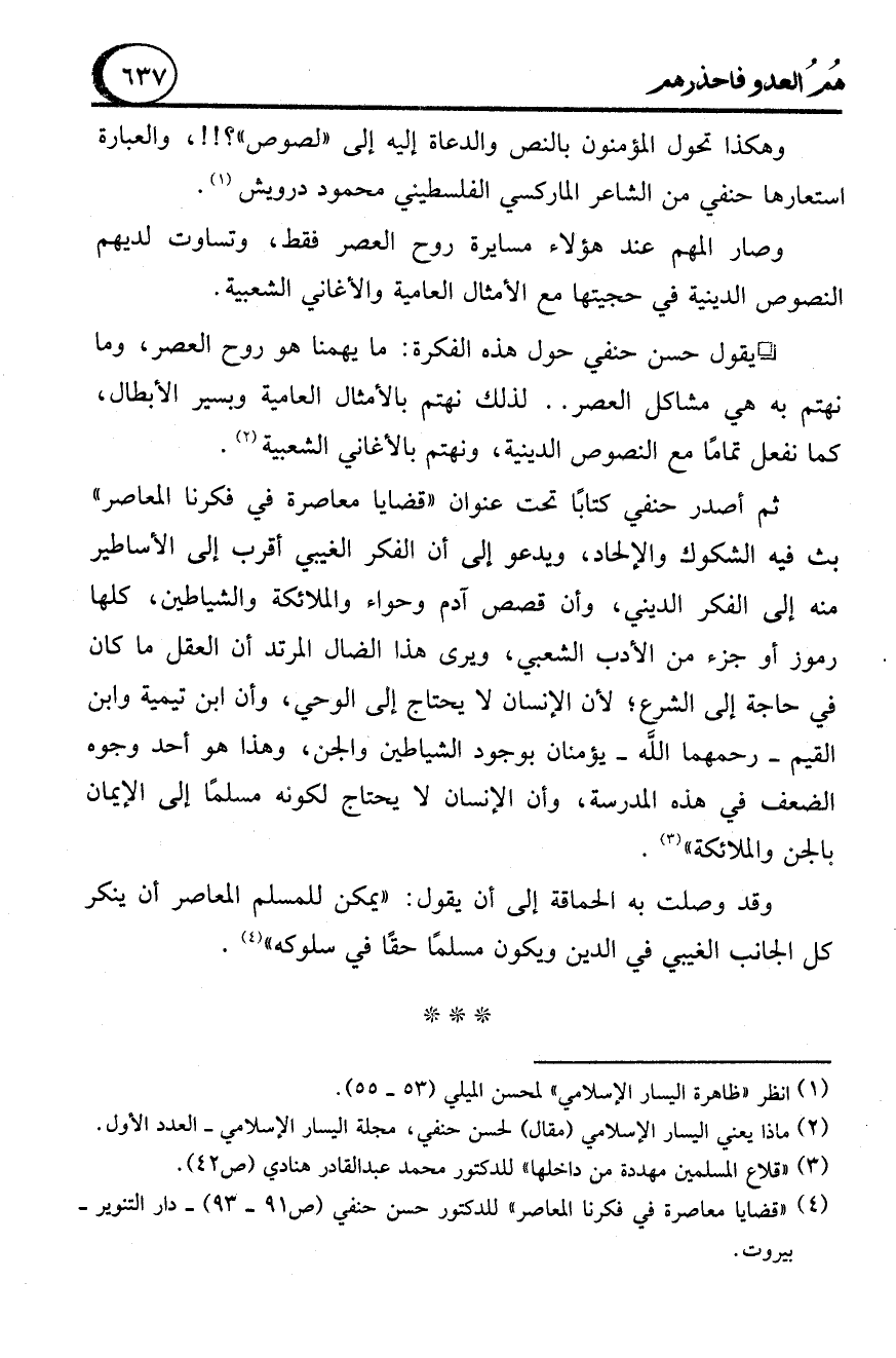 (4) "قضايا معاصرة في فكرنا المعاصر" للدكتور حسن حنفي (ص 91 - 93) - دار التنوير - بيروت.