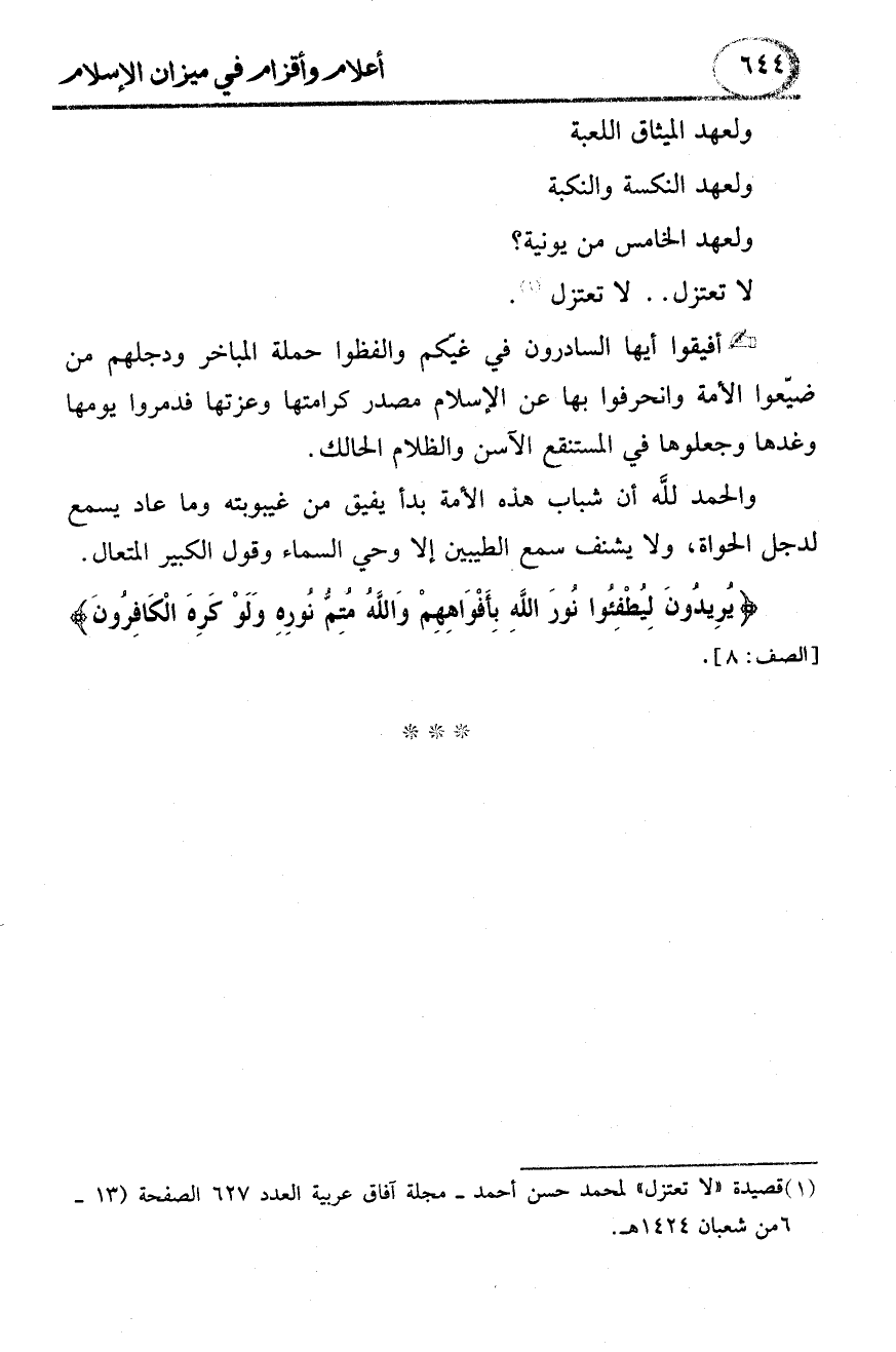 (1) قصيدة "لا تعتزل" لمحمد حسن أحمد - مجلة آفاق عربية العدد 627 الصفحة (13 - 6 من شعبان 1424 هـ).