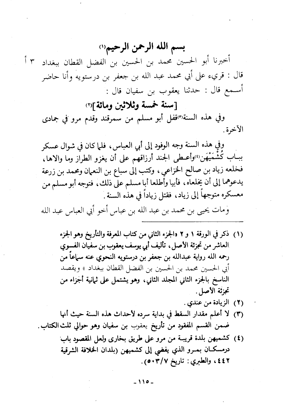[1] ذكر في الورقة 1 و 2 «الجزء الثاني من كتاب المعرفة والتأريخ وهو الجزء العاشر من تجزئة الأصل، تأليف أبي يوسف يعقوب بن سفيان الفسوي رحمه الله رواية عبد الله بن جعفر بن درستويه النحويّ عنه سماعا من أبي الحسن محمد بن الحسين بن الفضل القطان ببغداد» ويقصد الناسخ بالجزء الثاني المجلد الثاني، وهو يشتمل على ثمانية أجزاء من تجزئة الأصل.