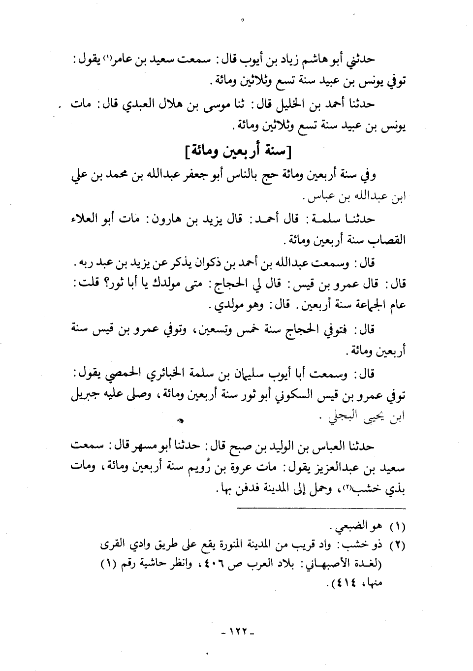 حَدَّثَنَا الْعَبَّاسُ بْنُ الْوَلِيدِ بْنِ صُبْحٍ قَالَ: حَدَّثَنَا أَبُو مُسْهِرٍ قَالَ: سَمِعْتُ سَعِيدَ بْنَ عَبْدِ الْعَزِيزِ يَقُولُ: مَاتَ عُرْوَةُ بْنُ رُوَيْمٍ سَنَةَ أَرْبَعِينَ وَمِائَةٍ، وَمَاتَ بِذِي خَشَبٍ [2] ، وحمل الى المدينة فدفن بها.