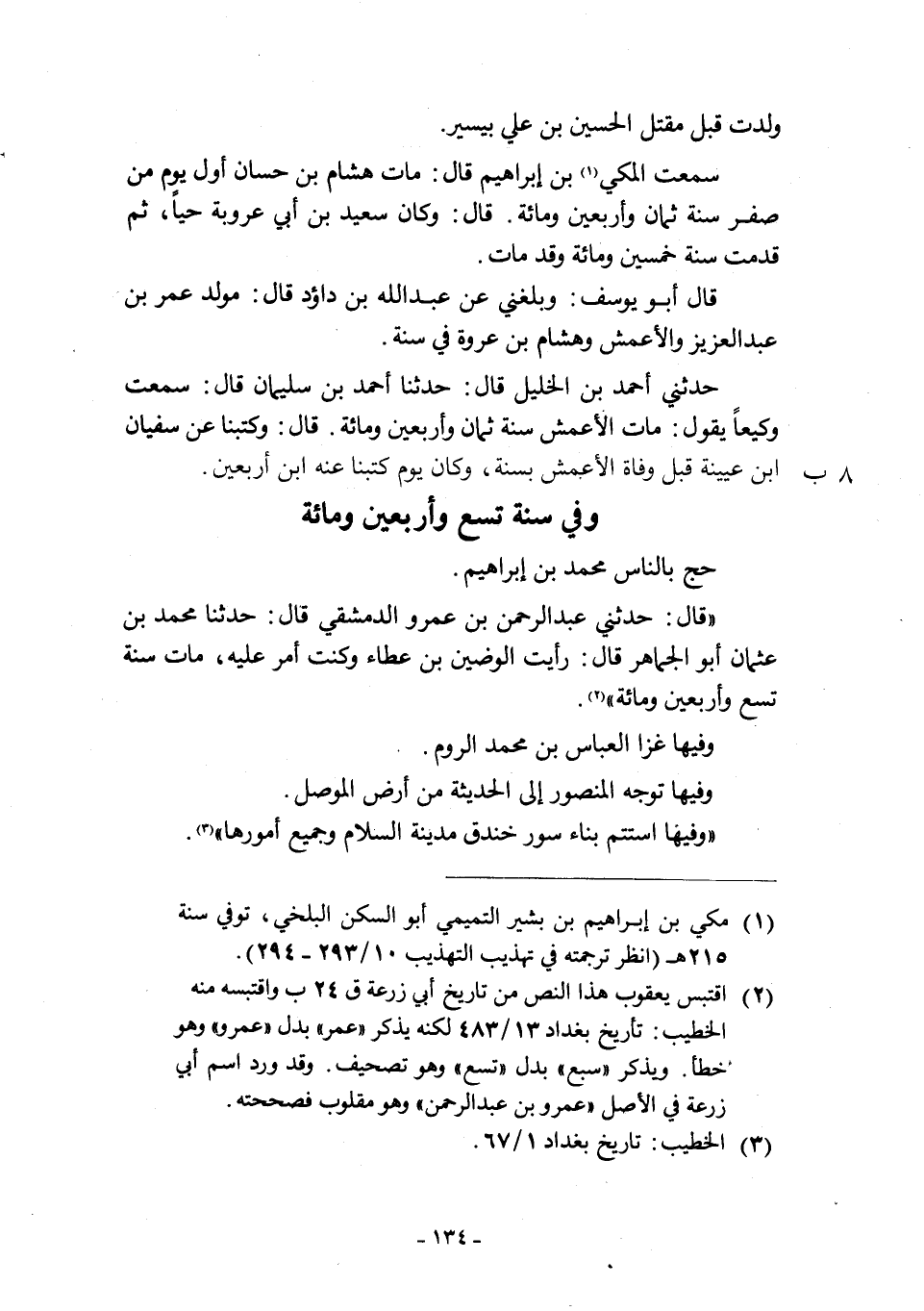 سَمِعْتُ الْمَكِّيَّ [1] بْنَ إِبْرَاهِيمَ قَالَ: مَاتَ هِشَامُ بْنُ حَسَّانٍ أَوَّلَ يَوْمٍ مِنْ صَفَرٍ سَنَةَ ثَمَانٍ وَأَرْبَعِينَ وَمِائَةٍ. قَالَ: وَكَانَ سَعِيدُ بْنُ أَبِي عَرُوبَةَ حَيًّا، ثُمَّ قَدِمْتُ سَنَةَ خَمْسِينَ وَمِائَةٍ وَقَدْ مَاتَ.