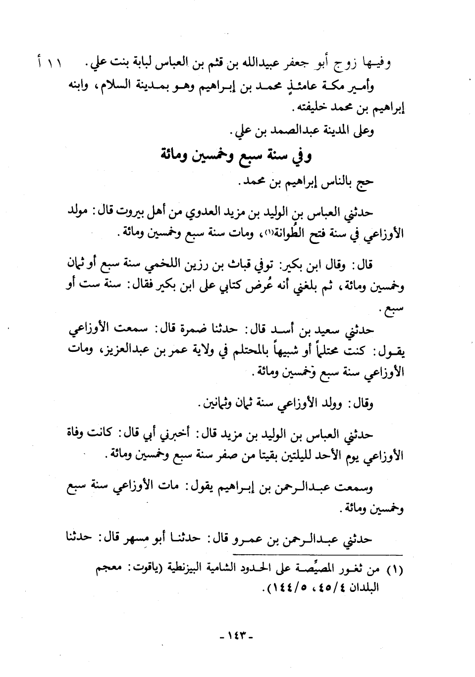 حَدَّثَنِي الْعَبَّاسُ بْنُ الْوَلِيدِ بْنِ مَزْيَدٍ الْعَدَوِيُّ مِنْ أَهْلِ بَيْرُوتَ قَالَ: مَوْلِدُ الْأَوْزَاعِيِّ فِي سَنَةِ فَتْحِ الطُّوَانَةِ [1] ، وَمَاتَ سَنَةَ سَبْعٍ وَخَمْسِينَ وَمِائَةٍ.