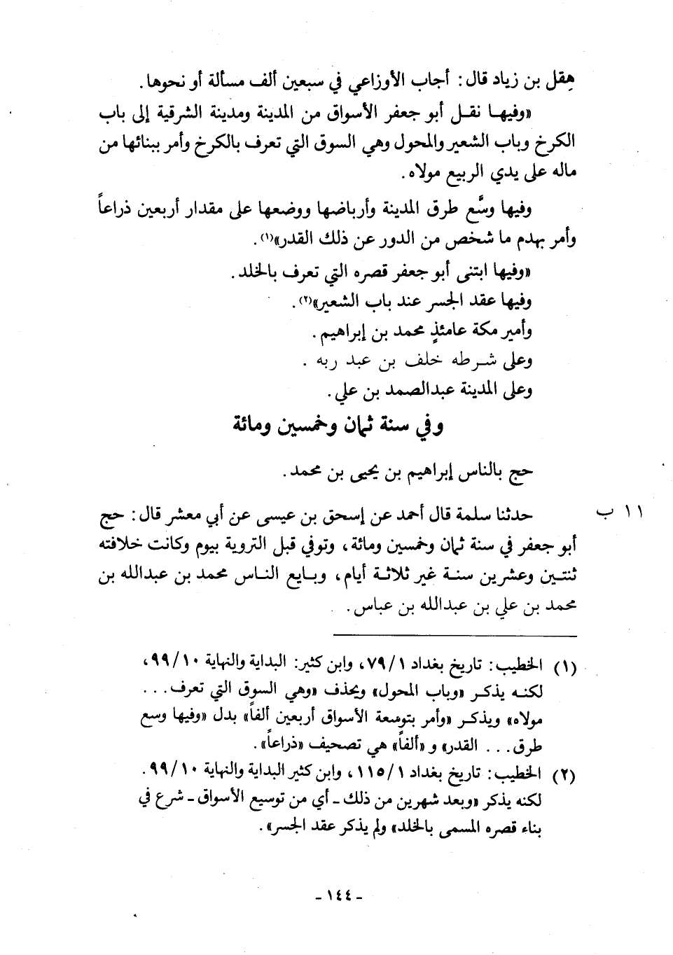 [1] الخطيب: تاريخ بغداد 1/ 79، وابن كثير: البداية والنهاية 10/ 99، لكنه يذكر «وباب المحول» ويحذف «وهي السوق التي تعرف ... مولاه» ويذكر «وامر بتوسعة الأسواق أربعين ألفا» بدل «وفيها وسع طرق ... القدر» و «ألفا» هي تصحيف «ذراعا» .