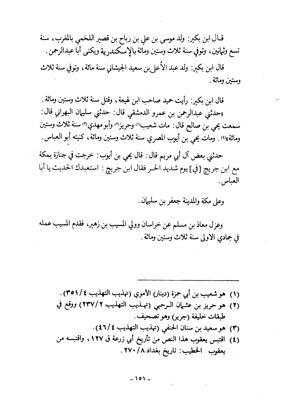 «حَدَّثَنِي عَبْدُ الرَّحْمَنِ بْنُ عَمْرٍو الدِّمَشْقِيُّ قَالَ: حدثني سليمان البهراني قال: سمعت يحي بْنَ صَالِحٍ قَالَ: مَاتَ شُعَيْبٌ [1] وَحَرِيزٌ [2] وَأَبُو مهدي [3] سنة ثلاث وستين ومائة» [4] . ومات يحي بْنُ أَيُّوبَ الْمِصْرِيُّ سَنَةَ ثَلَاثٍ وَسِتِّينَ وَمِائَةٍ، كُنْيَتُهُ أَبُو الْعَبَّاسِ.