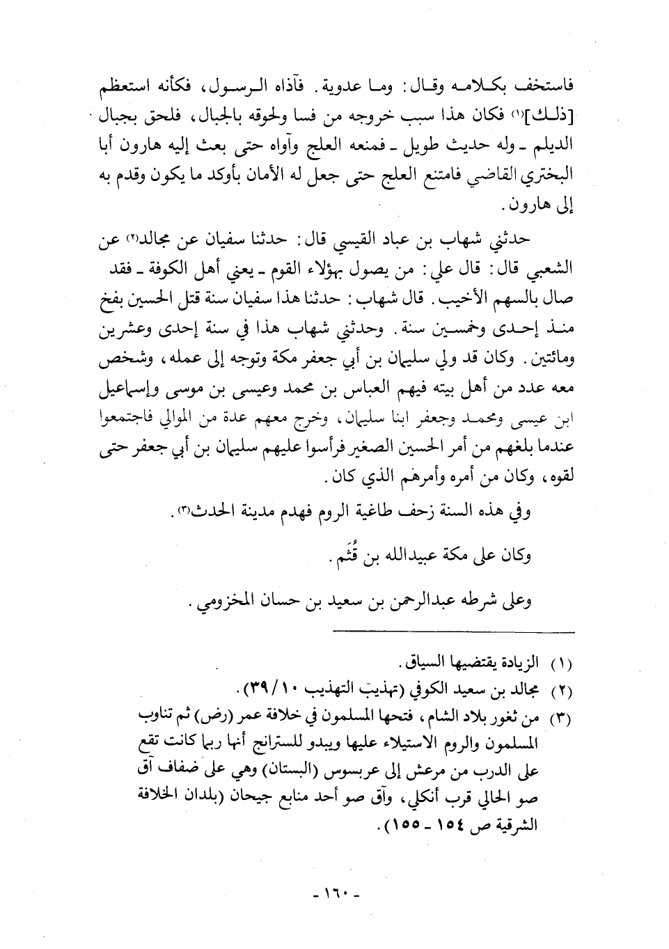 صَالَ بِالسَّهْمِ الْأَخْيَبِ. قَالَ شِهَابٌ: حَدَّثَنَا هَذَا سُفْيَانُ سَنَةَ قُتِلَ الْحُسَيْنُ بِفَخَّ مُنْذُ إِحْدَى وَخَمْسِينَ سَنَةً. وَحَدَّثَنِي شِهَابٌ هَذَا فِي سَنَةِ إِحْدَى وَعِشْرِينَ وَمِائَتَيْنِ. وَكَانَ قَدْ وَلِيَ سُلَيْمَانُ بْنُ أَبِي جَعْفَرٍ مَكَّةَ وَتَوَجَّهَ إِلَى عَمَلِهِ، وَشَخَصَ مَعَهُ عَدَدٌ مِنْ أَهْلِ بَيْتِهِ فِيهِمُ الْعَبَّاسُ بْنُ مُحَمَّدٍ وَعِيسَى بْنُ مُوسَى وَإِسْمَاعِيلُ بْنُ عِيسَى وَمُحَمَّدٌ وَجَعْفَرٌ ابْنَا سُلَيْمَانَ، وخرج معهم عدة من الموالي فاجمعوا عند ما بلغهم من أمر الحسين الصغير فرأسوا عليهم سليمان ابن أَبِي جَعْفَرٍ حَتَّى لَقَوْهُ، وَكَانَ مِنْ أَمْرِهِ وَأَمْرِهِمُ الَّذِي كَانَ.