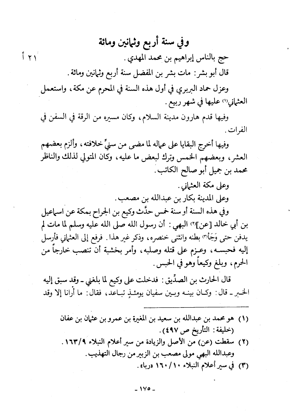 وَفِي هَذِهِ السَّنَةِ أَوْ سَنَةِ خَمْسٍ حَدَّثَ وَكِيعُ بن الجراح بمكة عن عَنْ إِسْمَاعِيلَ بْنِ أَبِي خَالِدٍ الْبَهِيِّ [2] : أَنَّ رَسُولَ اللَّهِ صَلَّى اللَّهُ عَلَيْهِ وَسَلَّمَ لَمَّا مَاتَ لَمْ يُدْفَنْ حَتَّى وَجَأَ بَطْنُهُ وَانْثَنَى خِنْصَرُهُ، وَذَكَرَ غَيْرَ هَذَا. فَرَفَعَ إِلَى الْعُثْمَانِيِّ فأرسل اليه فحبسه، وعزم على قَتْلَهُ وَصَلْبَهُ، وَأَمَرَ بِخَشَبَةٍ أَنْ تُنْصَبَ خَارِجًا مِنَ الْحَرَمِ، وَبَلَغَ وَكِيعًا وَهُوَ فِي الْحَبْسِ.