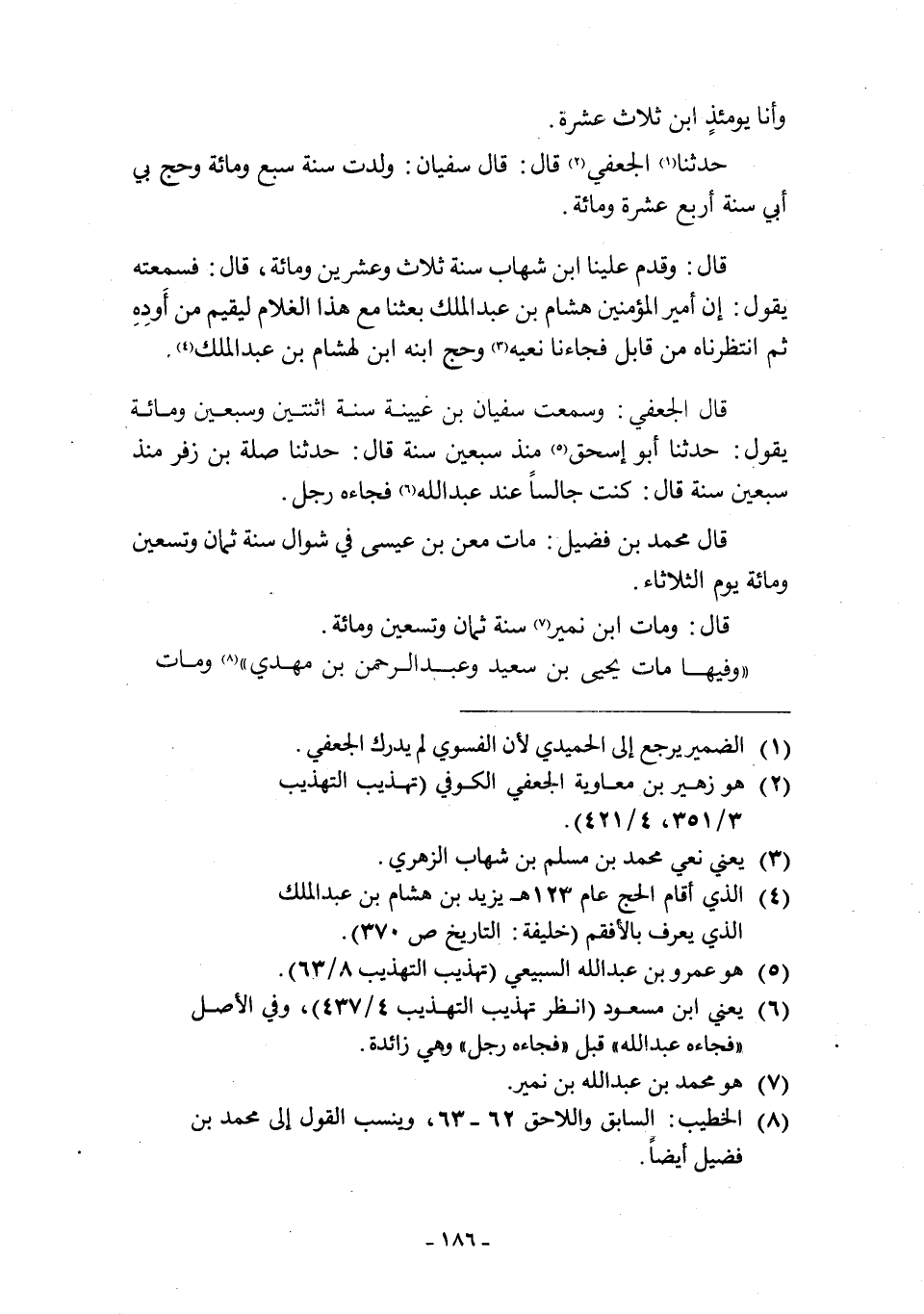 حَدَّثَنَا [1] الْجُعْفِيُّ [2] قَالَ: قَالَ سُفْيَانُ: وُلِدْتُ سَنَةَ سَبْعٍ وَمِائَةٍ وَحَجَّ بِي أَبِي سَنَةَ أَرْبَعَ عَشْرَةَ وَمِائَةٍ.
