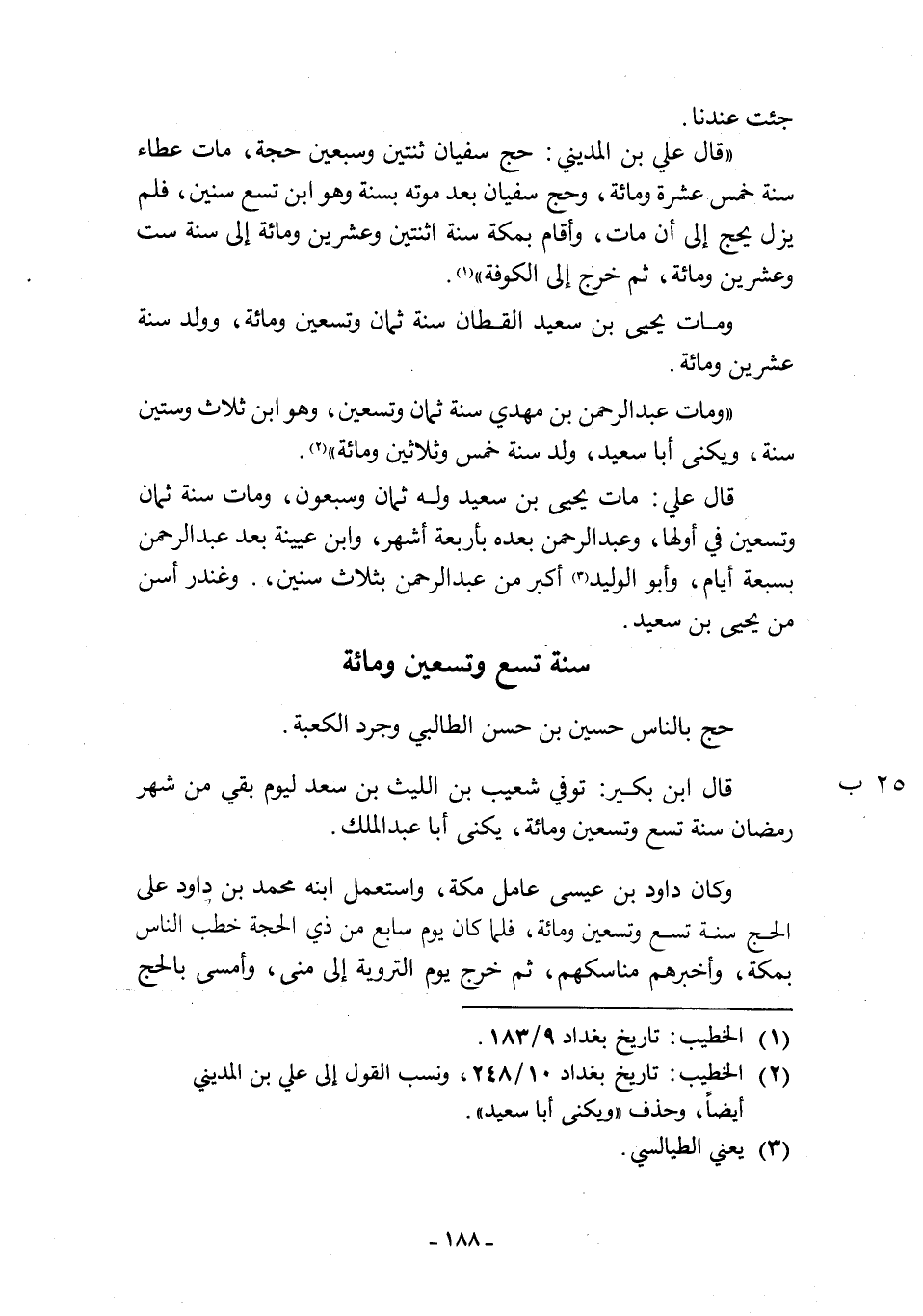 «وَمَاتَ عَبْدُ الرَّحْمَنِ بْنُ مَهْدِيٍّ سَنَةَ ثَمَانٍ وَتِسْعِينَ، وَهُوَ ابْنُ ثَلَاثٍ وَسِتِّينَ سَنَةً، وَيُكَنَّى أَبَا سَعِيدٍ، وَلُدَ سَنَةَ خَمْسٍ وَثَلَاثِينَ وَمِائَةٍ» [2] .