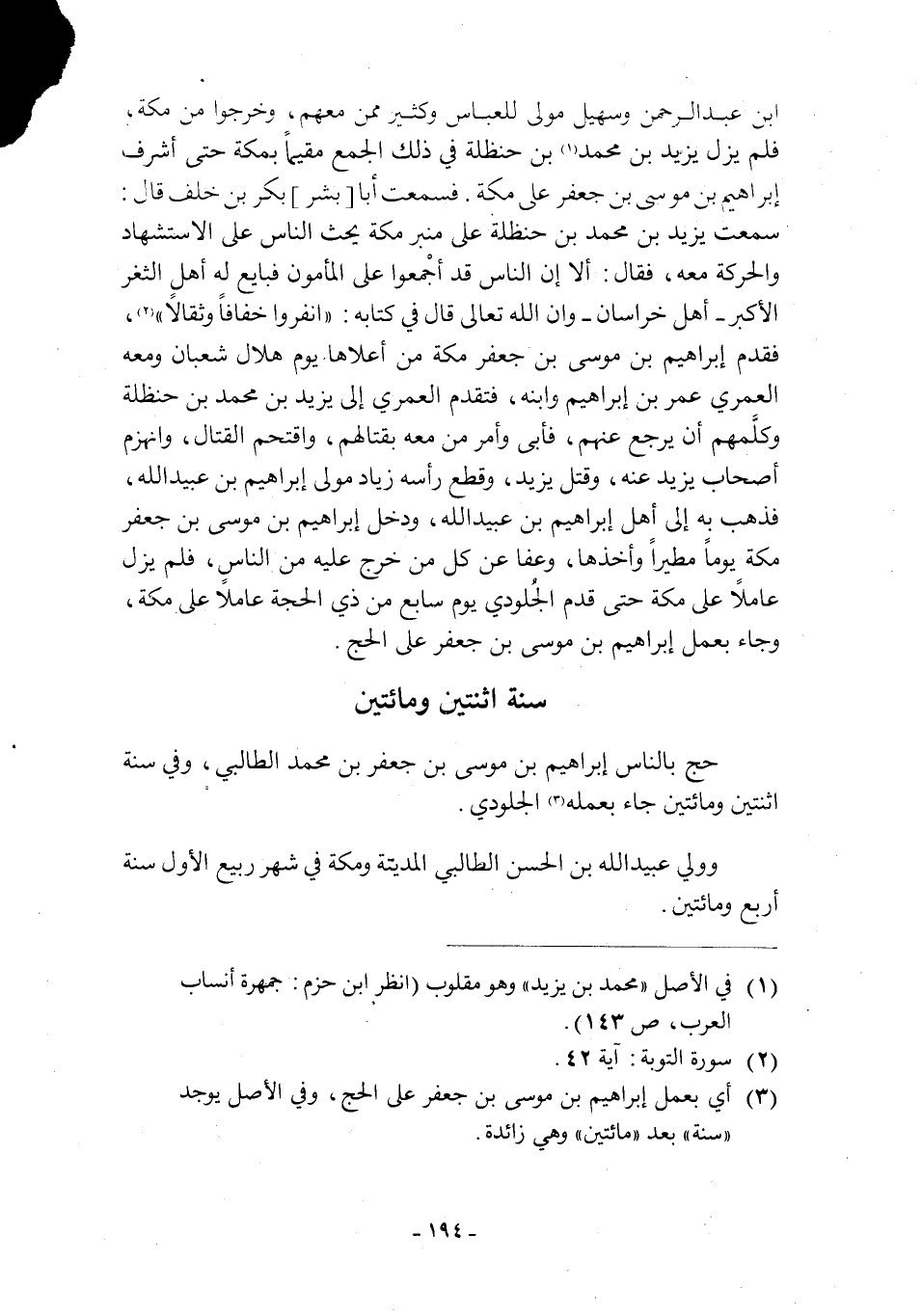 [3] اي بِعَمَلِ إِبْرَاهِيمَ بْنِ مُوسَى بْنِ جَعْفَرٍ عَلَى الحج، وفي الأصل يوجد «سنة» بعد «مائتين» وهي زائدة.