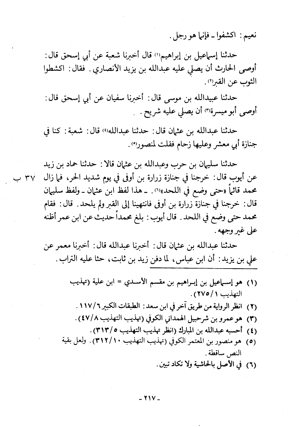 حَدَّثَنَا سُلَيْمَانُ بْنُ حَرْبٍ وَعَبْدُ اللَّهِ بْنُ عُثْمَانَ قَالا: حَدَّثَنَا حَمَّادُ بْنُ زَيْدٍ عَنْ أَيُّوبَ قَالَ: خَرَجْنَا فِي جِنَازَةِ زُرَارَةَ بْنِ أَوْفَى فِي يَوْمٍ شَدِيدِ الْحَرِّ، فَمَا زَالَ مُحَمَّدٌ قَائِمًا «حَتَّى وُضِعَ فِي اللَّحْدِ» [6] . - هَذَا لَفْظُ ابْنِ عُثْمَانَ- وَلَفْظُ سُلَيْمَانَ قَالَ: خَرَجْنَا فِي جِنَازَةِ زُرَارَةَ بْنِ أَوْفَى فَانْتَهَيْنَا إِلَى الْقَبْرِ وَلَمْ يُلَحَّدْ. قَالَ: فَقَامَ مُحَمَّدٌ حَتَّى وُضِعَ فِي اللَّحْدِ. قَالَ أَيُّوبُ: بَلَغَ مُحَمَّدًا حَدِيثٌ عَنِ ابْنِ عُمَرَ أَظُنُّهُ عَلَى غَيْرِ وَجْهِهِ.