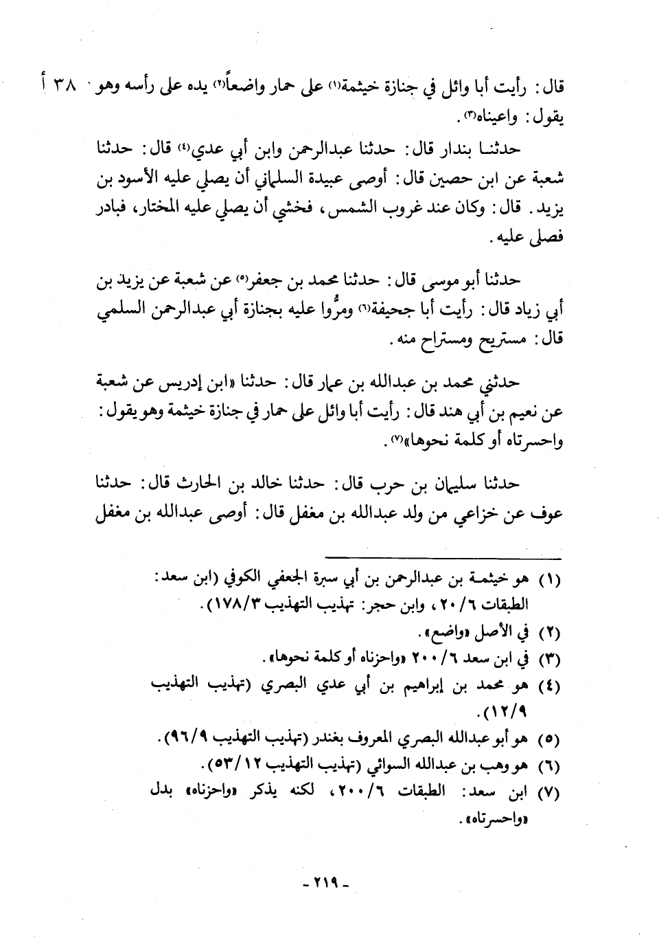 حَدَّثَنِي مُحَمَّدُ بْنُ عَبْدِ اللَّهِ بْنِ عَمَّارٍ قَالَ حَدَّثَنَا «ابْنُ إِدْرِيسَ عَنْ شُعْبَةَ عَنْ نُعَيْمِ بْنِ أَبِي هِنْدٍ قَالَ: رَأَيْتُ أَبَا وَائِلٍ عَلَى حمار في جنازة خيثمة وهو يقول: وا حسرتاه أَوْ كَلِمَةً نَحْوَهَا» [7] .