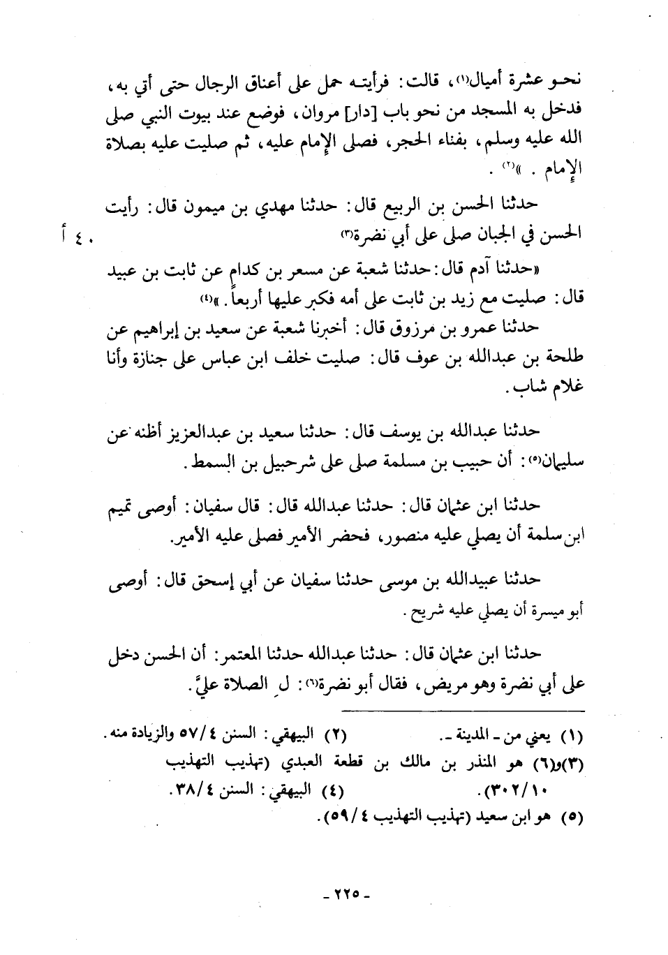 حَدَّثَنَا ابْنُ عُثْمَانَ قَالَ: حَدَّثَنَا عَبْدُ اللَّهِ قَالَ: قَالَ سُفْيَانُ: أَوْصَى تَمِيمُ ابن سَلَمَةَ أَنْ يُصَلِّيَ عَلَيْهِ مَنْصُورٌ، فَحَضَرَ الْأَمِيرُ فَصَلَّى عَلَيْهِ الْأَمِيرُ.