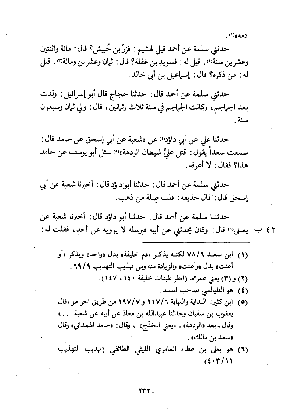 حَدَّثَنِي سَلَمَةُ عَنْ أَحْمَدَ قِيلَ لِهُشْيَمٍ: فَزِرُّ بْنُ حُبْيَشٍ؟ قَالَ: مِائَةً وَاثْنَتَيْنِ وَعِشْرِينَ سَنَةً [2] . قِيلَ لَهُ: فَسُوَيْدُ بْنُ غَفَلَةَ؟ قَالَ: ثَمَانٍ وَعِشْرِينَ وَمِائَةً [3] . قيل له: من ذكره؟ قَالَ: إِسْمَاعِيلُ بْنُ أَبِي خَالِدٍ.