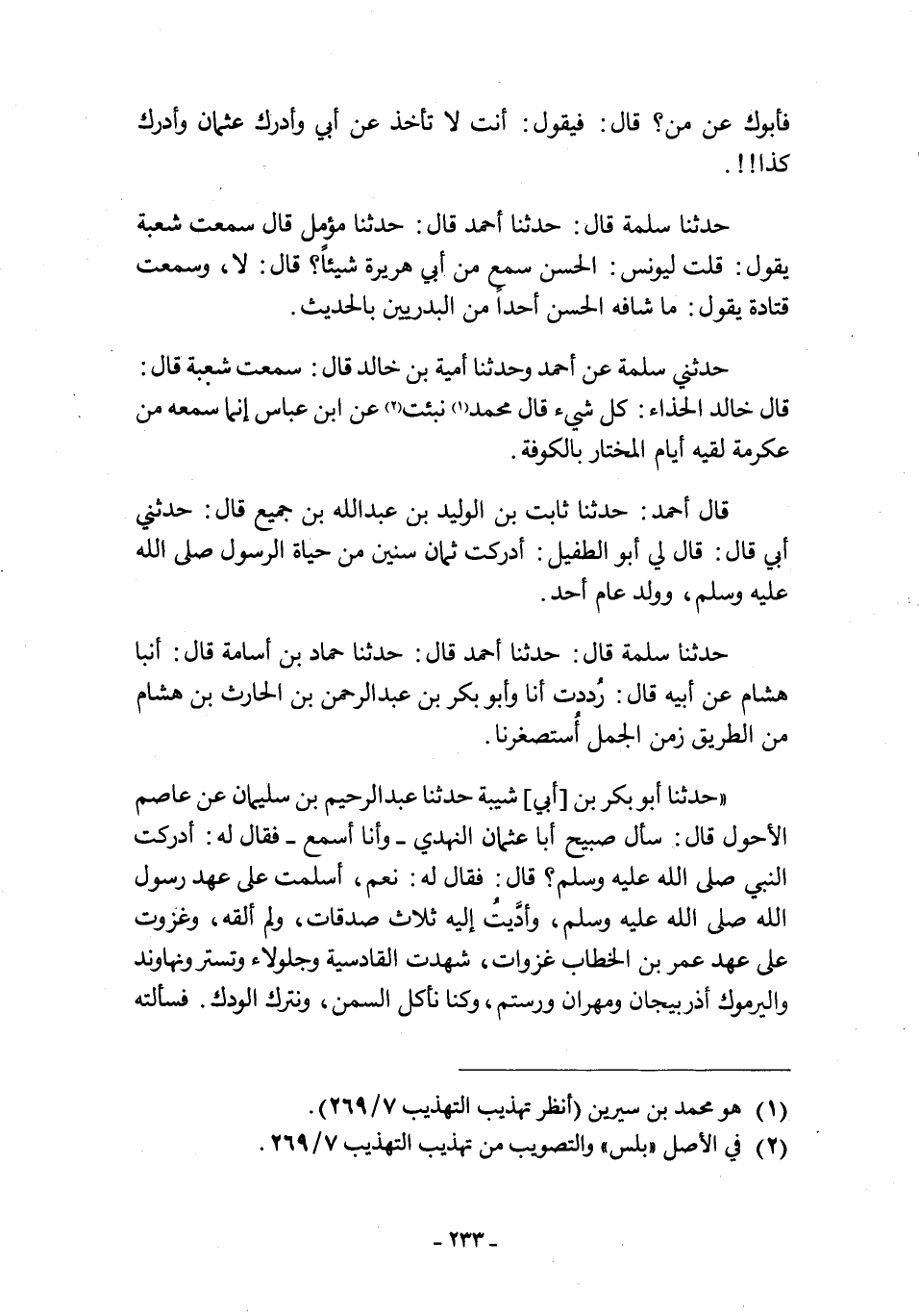 حَدَّثَنِي سَلَمَةُ عَنْ أَحْمَدَ وَحَدَّثَنَا أُمَيَّةُ بْنُ خَالِدٍ قَالَ: سَمِعْتُ شُعْبَةَ قَالَ: قَالَ خَالِدٌ الْحَذَّاءُ: كُلُّ شَيْءٍ قَالَ مُحَمَّدٌ [1] نُبِّئْتُ [2] عَنِ ابْنِ عَبَّاسٍ انما سمعه من عكرمة لقيه أيام الْمُخْتَارُ بِالْكُوفَةِ.
