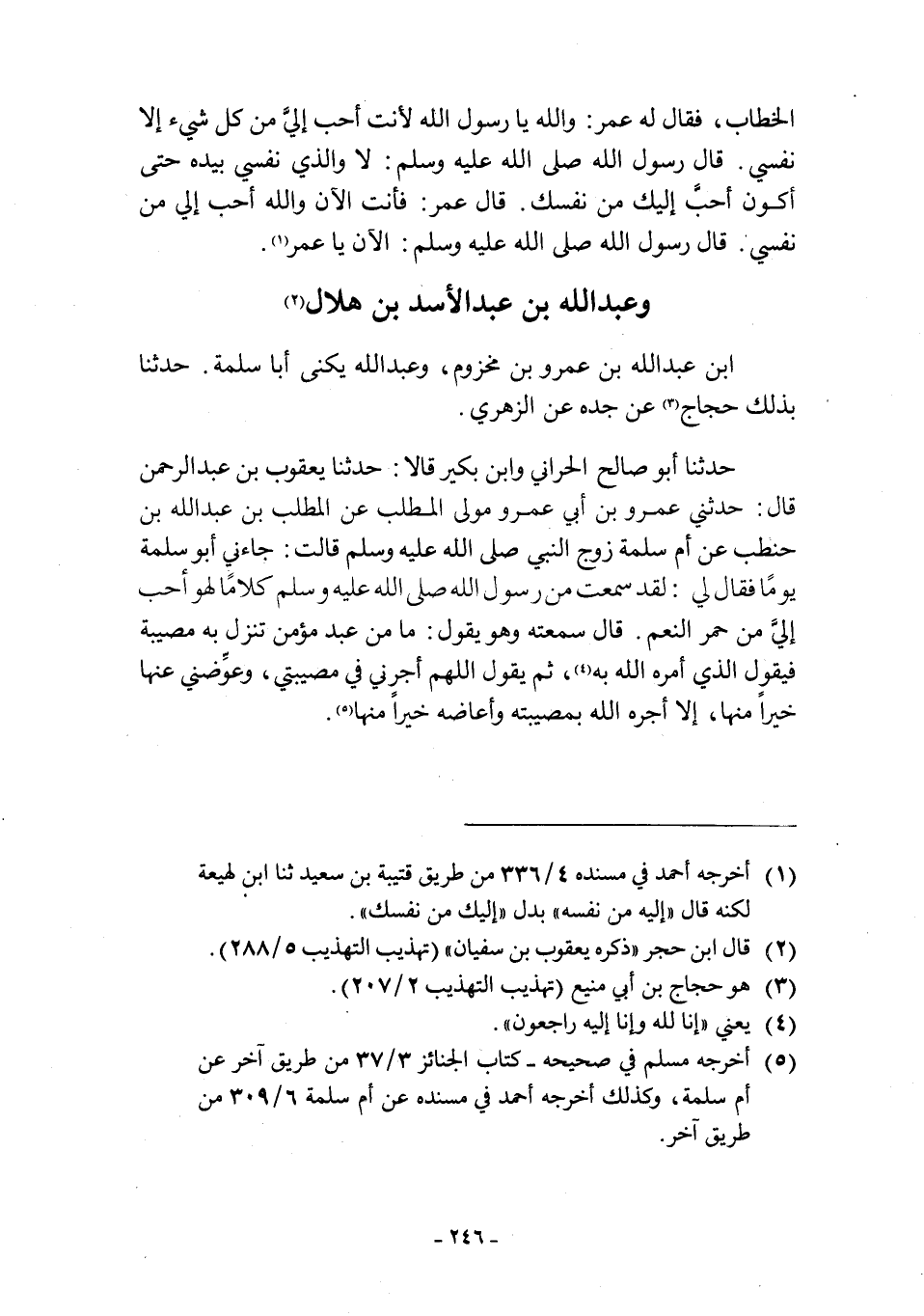 حَدَّثَنَا أَبُو صَالِحٍ الْحَرَّانِيُّ وَابْنُ بُكَيْرٍ قَالا: حَدَّثَنَا يَعْقُوبُ بْنُ عَبْدِ الرَّحْمَنِ قَالَ: حَدَّثَنِي عَمْرُو بْنُ أَبِي عَمْرٍو مَوْلَى الْمُطَّلِبِ عَنِ الْمُطَّلِبِ بْنِ عَبْدِ اللَّهِ بْنِ حَنْطَبٍ عَنْ أُمِّ سَلَمَةَ زَوْجِ النَّبِيِّ صَلَّى اللَّهُ عَلَيْهِ وَسَلَّمَ قَالَتْ: جَاءَنِي أَبُو سَلَمَةَ يَوْمًا فَقَالَ لِي: سَمِعْتُ مِنْ رَسُولِ اللَّهِ صَلَّى اللَّهُ عَلَيْهِ وَسَلَّمَ كَلَامًا لَهُوَ أَحَبُّ إِلَيَّ مِنْ حُمْرِ النَّعَمِ. قَالَ سَمِعْتُهُ وَهُوَ يَقُولُ: مَا مِنْ عَبْدٍ مُؤْمِنٍ تَنْزِلُ بِهِ مُصِيبَةٌ فَيَقُولُ الَّذِي أَمَرَهُ اللَّهُ بِهِ [4] ، ثُمَّ يَقُولُ اللَّهمّ آجِرْنِي فِي مُصِيبَتِي، وَعَوِّضْنِي عَنْهَا خَيْرًا مِنْهَا، إِلَّا أَجَرَهُ اللَّهُ بمصيبته وأعاضه خيرا منها [5] .
