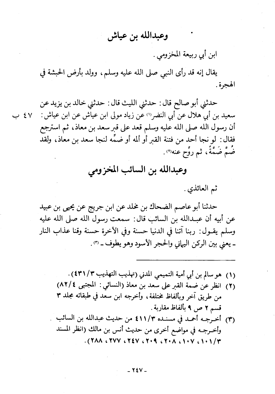 [2] انظر عن ضمة القبر على سعد بن معاذ (النسائي: المجتبى 4/ 82) من طريق آخر وبألفاظ مختلفة، وأخرجه ابن سعد في طبقاته مجلد 3 قسم 2 ص 9 بألفاظ مقاربة.