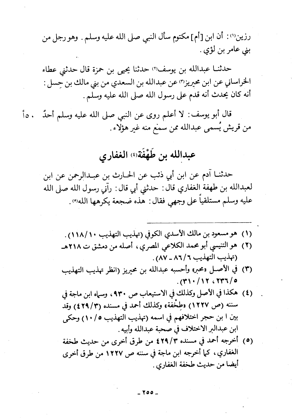 [4] هكذا في الأصل وكذلك في الاستيعاب ص 930، وسماه ابن ماجة في سننه (ص 1227) «طخفة» وكذلك أحمد في مسندة (3/ 429) وقد بين ابن حجر اختلافهم في اسمه (تهذيب التهذيب 5/ 10) وحكى ابن عبد البر الاختلاف في صحبة عبد الله وأبيه.