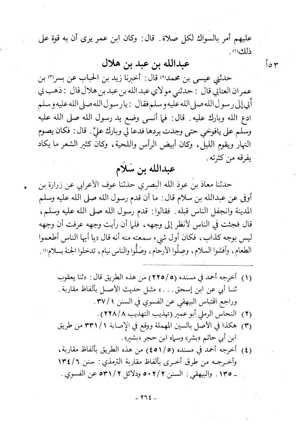 حَدَّثَنَا مُعَاذُ بْنُ عوذ اللَّهِ الْبَصْرِيُّ حَدَّثَنَا عَوْفٌ الْأَعْرَابِيُّ عَنْ زُرَارَةَ ابن أَوْفَى عَنْ عَبْدِ اللَّهِ بْنِ سَلَامٍ قَالَ: لَمَّا أَنْ قَدِمَ رَسُولُ اللَّهِ صَلَّى اللَّهُ عَلَيْهِ وَسَلَّمَ الْمَدِينَةَ وَانْجَفَلَ النَّاسُ قَبْلَهُ. فَقَالُوا: قَدِمَ رَسُولُ اللَّهِ صَلَّى اللَّهُ عَلَيْهِ وَسَلَّمَ، قَالَ فَجِئْتُ فِي النَّاسِ لِأَنْظُرَ إِلَى وَجْهِهِ، فَلَمَّا أَنْ رَأَيْتُ وَجْهَهُ عَرَفْتُ أَنَّ وَجْهَهُ لَيْسَ بِوَجْهِ كَذَّابٍ، فَكَانَ أَوَّلُ شَيْءٍ سَمِعْتُهُ مِنْهُ أَنَّهُ قَالَ «يَا أَيُّهَا النَّاسُ أَطْعِمُوا الطَّعَامَ، وَأَفْشُوا السَّلَامَ، وَصِلُوا الْأَرْحَامَ، وَصَلُّوا وَالنَّاسُ نيام تدخلوا الجنة بسلام [4] . انقضى الأنصار