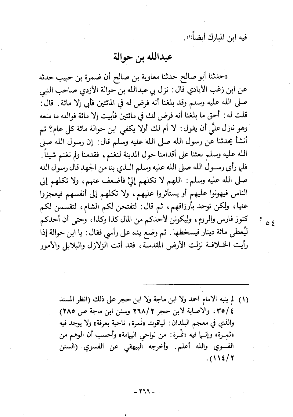 «حَدَّثَنَا أَبُو صَالِحٍ حَدَّثَنَا مُعَاوِيَةُ بْنُ صَالِحٍ أَنَّ ضَمْرَةَ بْنَ حَبِيبٍ حَدَّثَهُ عَنِ ابْنِ زُغْبٍ الْإِيَادِيِّ قَالَ: نَزَلَ بِي عَبْدُ اللَّهِ بْنُ حَوَالَةَ الْأَزْدِيُّ صَاحِبُ النَّبِيِّ صَلَّى اللَّهُ عَلَيْهِ وَسَلَّمَ وَقَدْ بَلَغَنَا أَنَّهُ فَرَضَ لَهُ فِي الْمِائَتَيْنِ فَأَبَى إِلَّا مِائَةً. قَالَ: قُلْتُ لَهُ: أَحَقٌّ مَا بَلَغَنَا أَنَّهُ فَرَضَ لَكَ فِي مِائَتَيْنِ فَأَبَيْتَ إِلَّا مِائَةً فو الله مَا مَنَعَهُ وَهُوَ نَازِلٌ عَلَيَّ أَنْ يَقُولَ: لَا أُمَّ لَكَ أَوَ لَا يَكْفِي ابْنَ حَوَالَةَ مِائَةٌ كُلَّ عَامٍ؟ ثُمَّ أَنْشَأَ يُحَدِّثُنَا عن رسول الله صلى الله عليه وسلم قال: