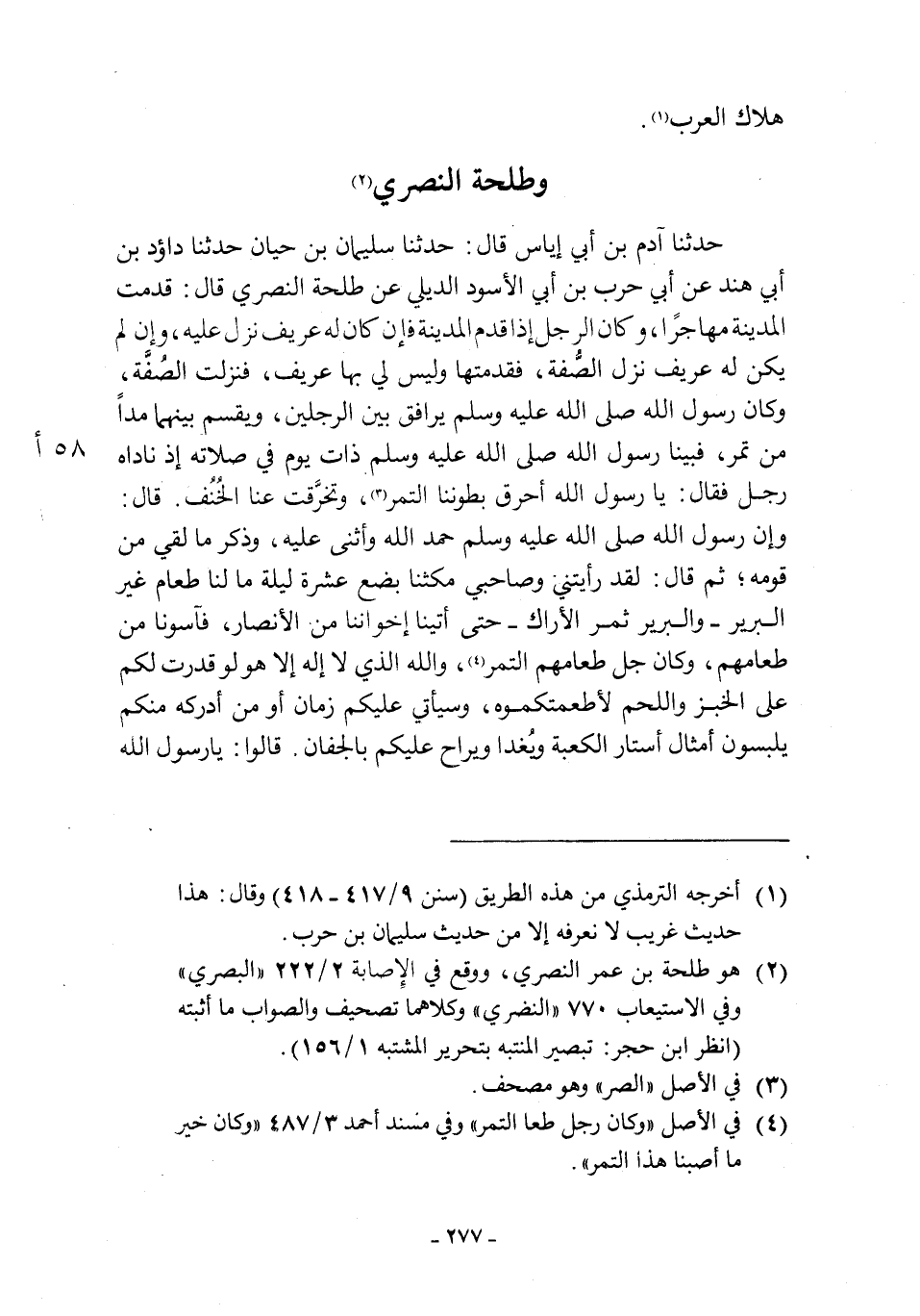 [2] هو طلحة بن عمر النصري، ووقع في الاصابة 2/ 222 «البصري» وفي الاستيعاب 770 «النضري» وكلاهما تصحيف والصواب ما أثبته (انظر ابن حجر: تبصير المنتبه بتحرير المشتبه 1/ 156) .