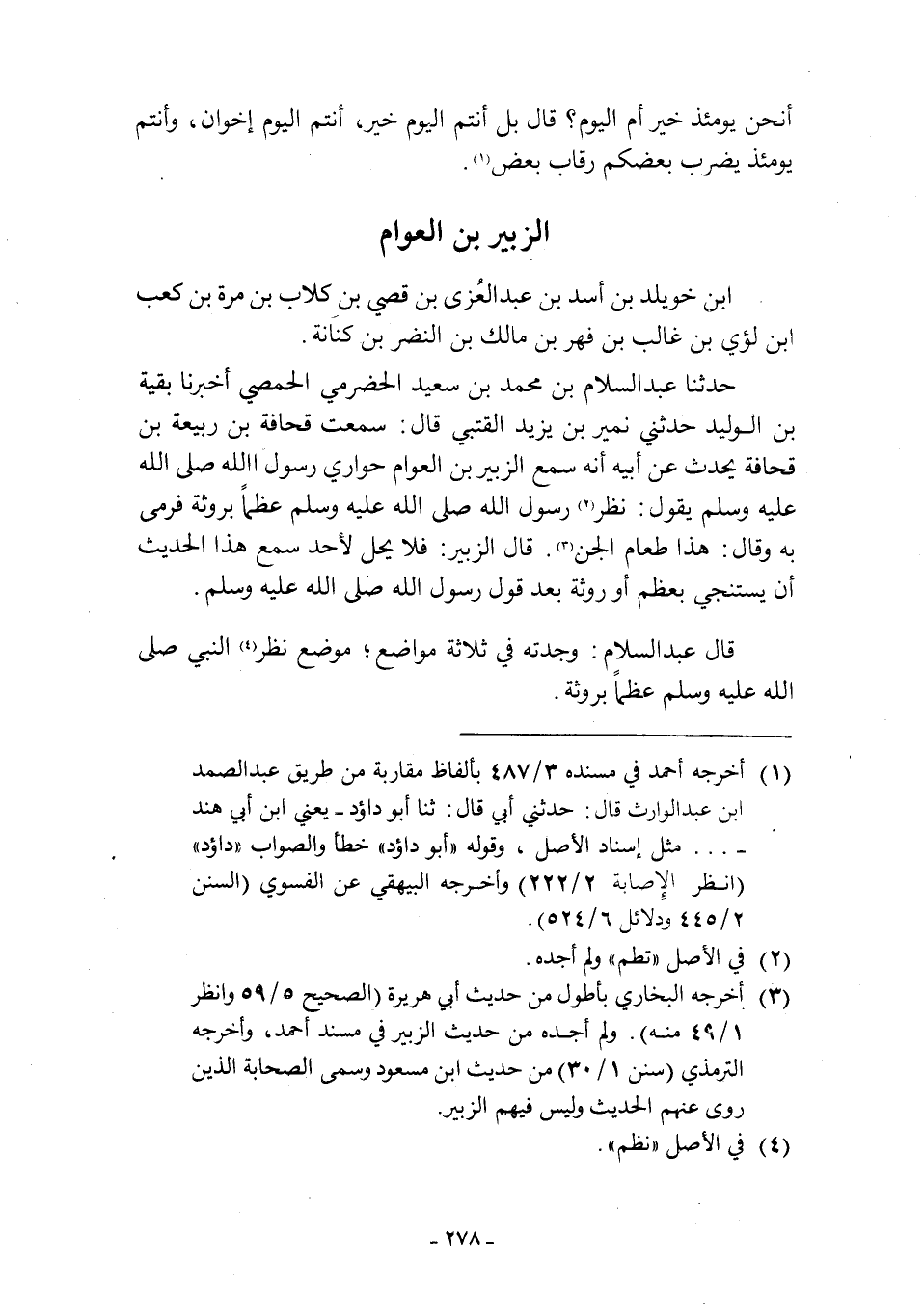 حَدَّثَنَا عَبْدُ السَّلَامِ بْنُ مُحَمَّدِ بْنِ سَعِيدٍ الْحَضْرَمِيُّ الحمصي أخبرنا بقية ابن الوليد حدثني نُمَيْرِ بْنِ يَزِيدَ الْقُتْبِيِّ قَالَ: سَمِعْتُ قُحَافَةَ بْنَ رَبِيعَةَ بْنِ قُحَافَةَ يُحَدِّثُ عَنْ أَبِيهِ أَنَّهُ سَمِعَ الزُّبَيْرَ بْنَ الْعَوَّامِ حَوَارِيَّ رَسُولَ اللَّهِ صَلَّى اللَّهُ عَلَيْهِ وَسَلَّمَ يَقُولُ: نَظَرَ [2] رَسُولُ اللَّهِ صَلَّى اللَّهُ عَلَيْهِ وَسَلَّمَ عَظْمًا بِرَوْثَةٍ فَرَمَى بِهِ وَقَالَ: هَذَا طَعَامُ الْجِنِّ [3] . قَالَ الزُّبَيْرُ: فَلَا يَحِلُّ لِأَحَدٍ سَمِعَ هَذَا الْحَدِيثَ أَنْ يَسْتَنْجِيَ بِعَظْمٍ أَوْ رَوْثَةٍ بَعْدَ قول رسول الله صلى الله عليه وسلم.