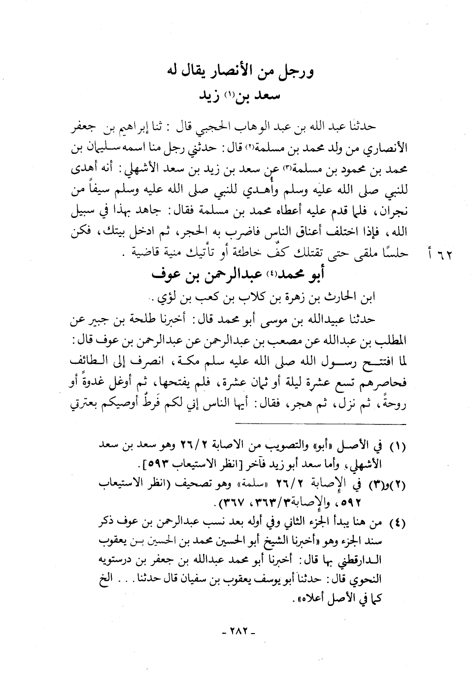 [1] في الأصل «أبو» والتصويب من الاصابة 2/ 26 وهو سعد ابن سعد الأشهلي، وأما سعد أبو زيد فآخر [انظر الاستيعاب 593] .