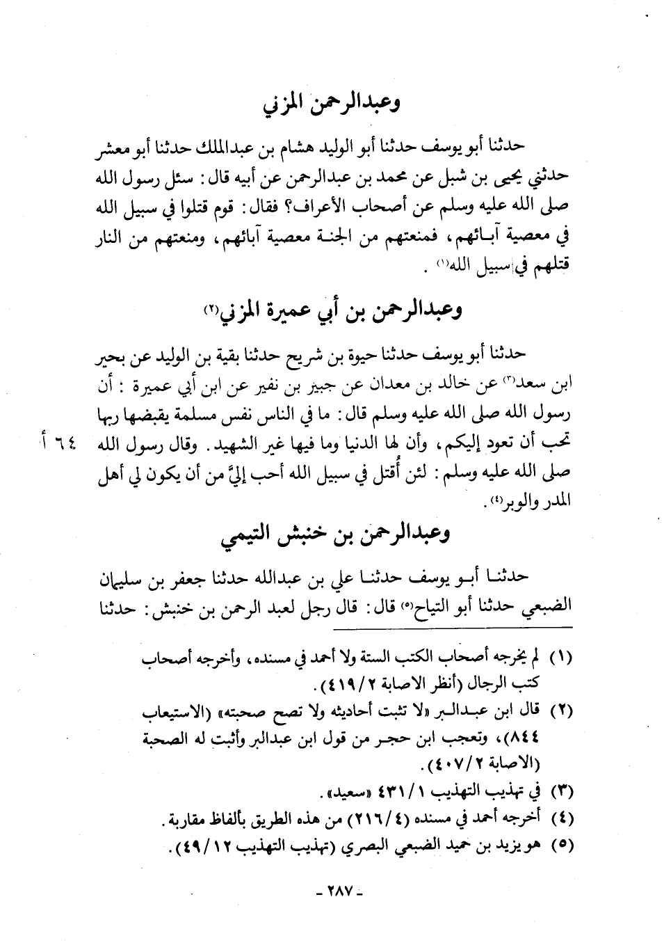 حَدَّثَنَا أَبُو يُوسُفَ حَدَّثَنَا أَبُو الْوَلِيدِ هِشَامُ بْنُ عَبْدِ الْمَلِكِ حَدَّثَنَا أبو معشر حدثني يحي بْنُ شِبْلٍ عَنْ مُحَمَّدِ بْنِ عَبْدِ الرَّحْمَنِ عن أبيه قَالَ: سُئِلَ رَسُولُ اللَّهِ صَلَّى اللَّهُ عَلَيْهِ وسلم عن أصحاب الأعراف؟ فقال. قوم قتلوا فِي سَبِيلِ اللَّهِ فِي مَعْصِيَةِ آبَائِهِمْ، فَمَنَعَتْهُمْ مِنَ الْجَنَّةِ مَعْصِيَةُ آبَائِهِمْ، وَمَنَعَتْهُمْ مِنَ النَّارِ قَتْلُهُمْ فِي سَبِيلِ اللَّهِ [1] .