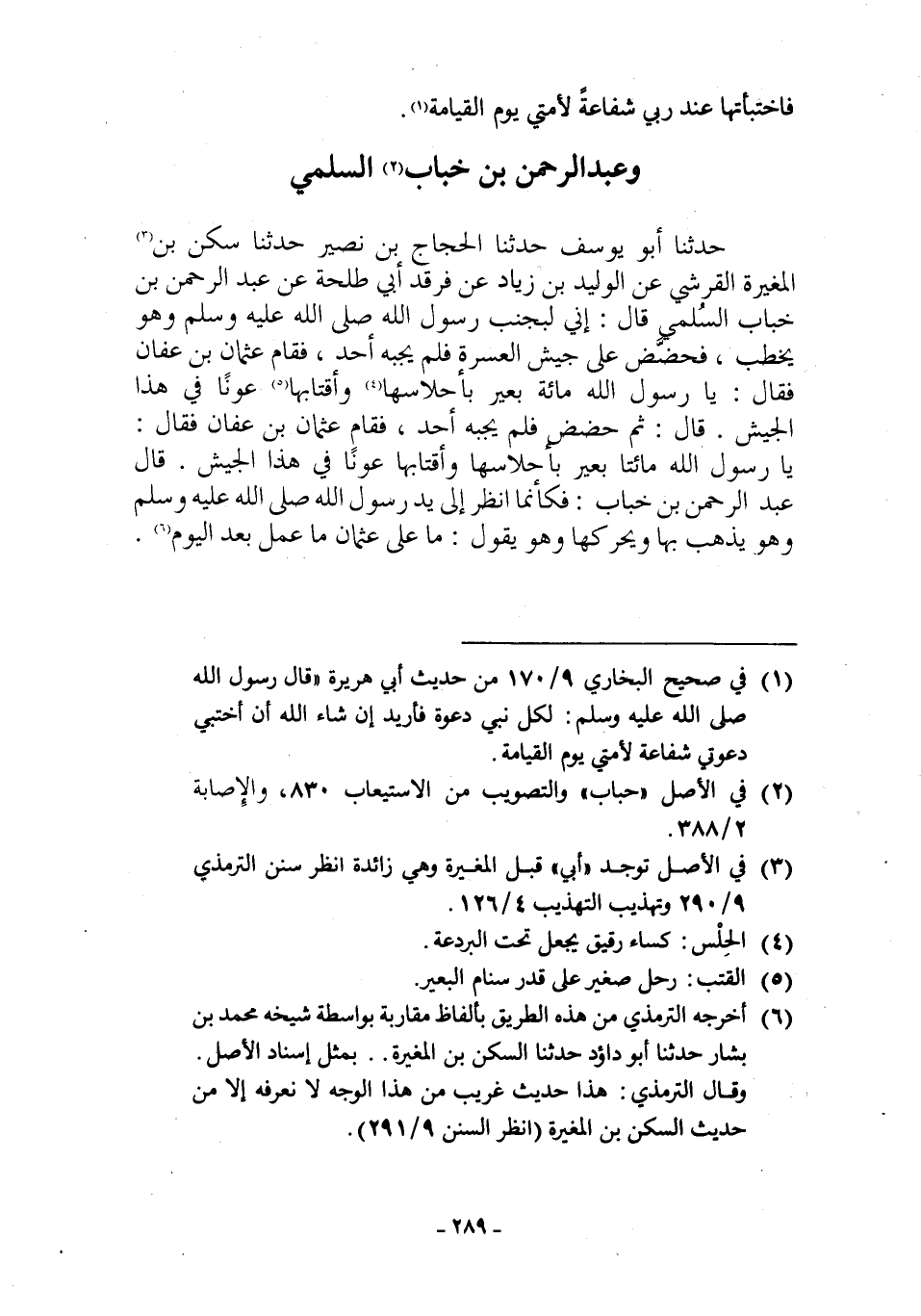 حدثنا أبو يوسف الْحَجَّاجُ بْنُ نُصَيْرٍ حَدَّثَنَا سَكَنُ بْنُ [3] الْمُغِيرَةِ الْقُرَشِيُّ عَنِ الْوَلِيدِ بْنِ زِيَادٍ عَنْ فَرْقَدٍ أَبِي طَلْحَةَ عَنْ عَبْدِ الرَّحْمَنِ بْنِ خَبَّابٍ السُّلَمِيِّ قَالَ: إِنِّي بِجَنْبِ رَسُولِ اللَّهِ صَلَّى اللَّهُ عَلَيْهِ وَسَلَّمَ وَهُوَ يَخْطُبُ، فَحَضَّضَ عَلَى جيش العسرة فَلَمْ يُجِبْهُ أَحَدٌ، فَقَامَ عُثْمَانُ بْنُ عَفَّانَ فَقَالَ:
