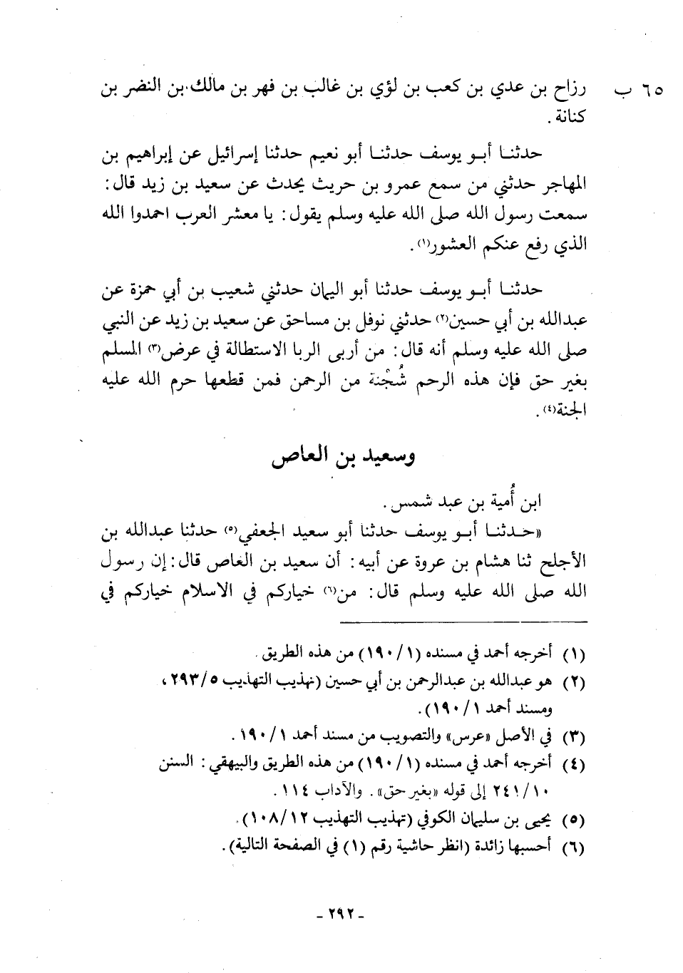 حَدَّثَنَا أَبُو يُوسُفَ حَدَّثَنَا أَبُو نُعَيْمٍ حَدَّثَنَا إِسْرَائِيلُ عَنْ إِبْرَاهِيمَ بْنِ الْمُهَاجِرِ حَدَّثَنِي مَنْ سَمِعَ عَمْرَو بْنَ حُرَيْثٍ يُحَدِّثُ عَنْ سَعِيدِ بْنِ زَيْدٍ قَالَ: سَمِعْتُ رَسُولَ اللَّهِ صَلَّى اللَّهُ عَلَيْهِ وَسَلَّمَ يَقُولُ: يَا مَعْشَرَ الْعَرَبِ احْمِدُوا اللَّهَ الّذي رفع عنكم العثور [1] . حَدَّثَنَا أَبُو يُوسُفَ حَدَّثَنَا أَبُو الْيَمَانِ حَدَّثَنِي شُعَيْبُ بْنُ أَبِي حَمْزَةَ عَنْ عَبْدِ اللَّهِ بْنِ أَبِي حُسَيْنٍ [2] حَدَّثَنِي نَوْفَلُ بْنُ مُسَاحِقٍ عَنْ سَعِيدِ بْنِ زَيْدٍ عَنِ النَّبِيِّ صَلَّى اللَّهُ عَلَيْهِ وَسَلَّمَ أَنَّهُ قَالَ: مِنْ أَرْبَى الرِّبَا الِاسْتِطَالَةُ فِي عِرْضِ [3] الْمُسْلِمِ بِغَيْرِ حَقٍّ فأن هذه الرحم شحنة مِنَ الرَّحْمَنِ فَمَنْ قَطَعَهَا حَرَّمَ اللَّهُ عَلَيْهِ الجنة [4] .