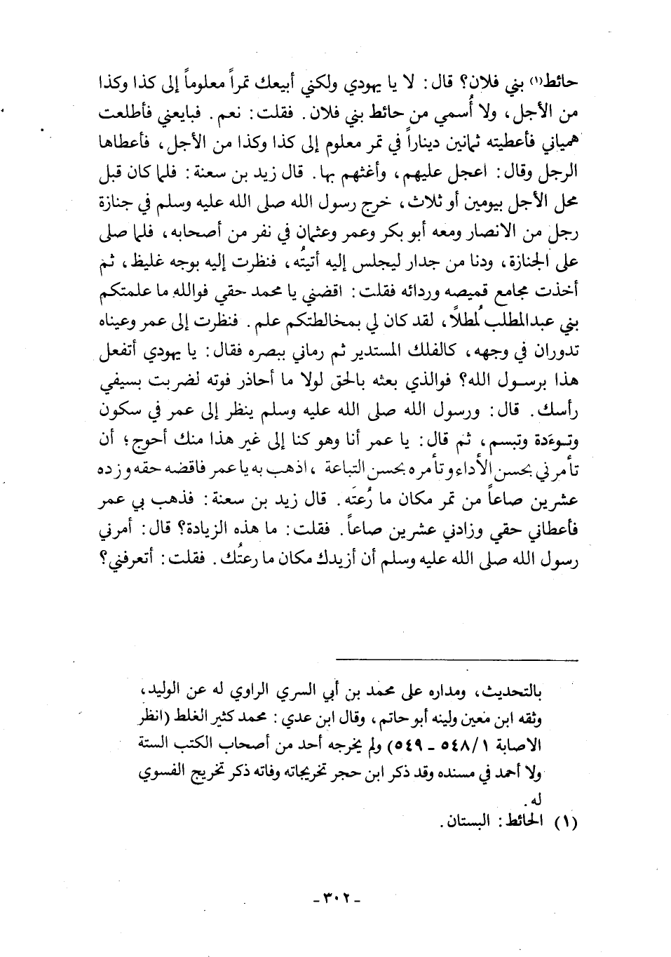 يَا مُحَمَّدُ هَلْ لَكَ أَنْ تَبِيعَنِي تَمْرًا مَعْلُومًا إِلَى أَجَلٍ مَعْلُومٍ وَمِنْ حَائِطِ [1] بَنِي فُلَانٍ؟ قَالَ: لَا يَا يَهُودِيُّ وَلَكِنِّي أَبِيعُكَ تَمْرًا مَعْلُومًا إِلَى كَذَا وَكَذَا مِنَ الْأَجَلِ، وَلَا أُسَمِّي مِنْ حَائِطِ بَنِي فُلَانٍ. فَقُلْتُ: نَعَمْ. فَبَايَعَنِي فَأَطْلَعْتُ هِمْيَانِي فَأَعْطَيْتُهُ ثَمَانِينَ دِينَارًا فِي تَمْرٍ مَعْلُومٍ إِلَى كَذَا وَكَذَا مِنَ الْأَجَلِ، فَأَعْطَاهَا الرَّجُلَ وَقَالَ: أَعْجِلْ عَلَيْهِمْ، وَأَغِثْهُمْ بِهَا. قَالَ زَيْدُ بْنُ سَعْنَةَ: