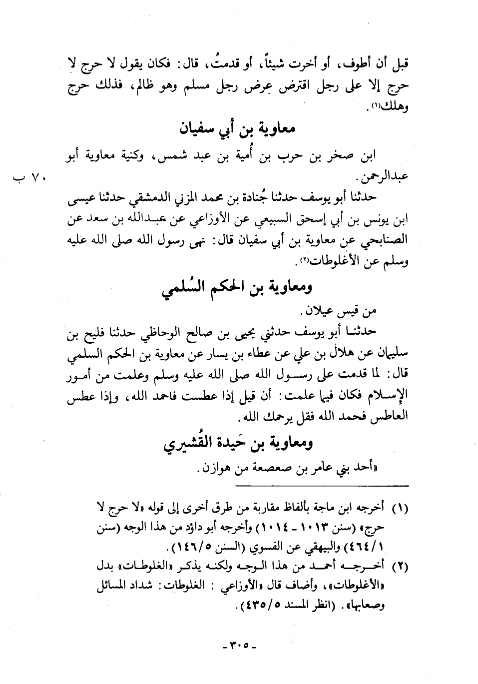حَدَّثَنَا أَبُو يُوسُفَ حَدَّثَنَا جُنَادَةُ بْنُ مُحَمَّدٍ الْمُزَنِيُّ الدِّمَشْقِيُّ حَدَّثَنَا عِيسَى بْنُ يُونُسَ بْنِ أَبِي إِسْحَاقَ السُّبَيْعِيُّ عَنِ الْأَوْزَاعِيِّ عَنْ عَبْدِ اللَّهِ ابن سَعْدٍ عَنِ الصَّنَابِحِيِّ عَنْ مُعَاوِيَةَ بْنِ أَبِي سُفْيَانَ قَالَ: نَهَى رَسُولُ اللَّهِ صَلَّى اللَّهُ عَلَيْهِ وَسَلَّمَ عَنِ الْأُغْلُوطَاتِ [2] .