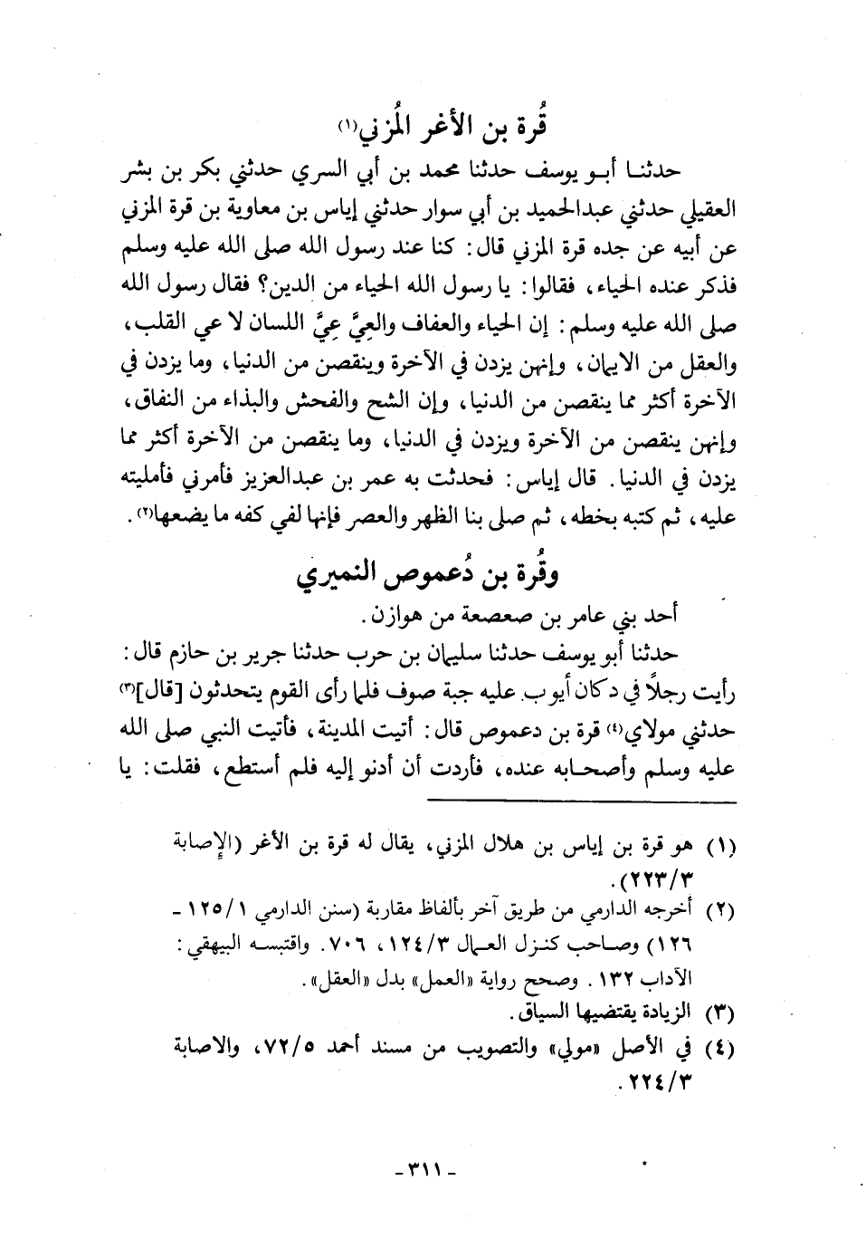 حَدَّثَنَا أَبُو يُوسُفَ حَدَّثَنَا مُحَمَّدُ بْنُ أَبِي السَّرِيِّ حَدَّثَنِي بَكْرُ بْنُ بِشْرٍ الْعُقَيْلِيُّ حَدَّثَنِي عَبْدُ الْحَمِيدِ بْنُ أَبِي سَوَّارٍ حَدَّثَنِي إِيَاسُ بْنُ مُعَاوِيَةَ بْنِ قُرَّةَ الْمُزَنِيُّ عَنْ أَبِيهِ عَنْ جَدِّهِ قُرَّةَ الْمُزَنِيِّ قَالَ: كُنَّا عِنْدَ رَسُولِ اللَّهِ صَلَّى الله عليه وسلم فذكر عِنْدَهُ الْحَيَاءُ، فَقَالُوا: يَا رَسُولَ اللَّهِ الْحَيَاءُ مِنَ الدِّينِ؟ فَقَالَ رَسُولُ اللَّهِ صَلَّى اللَّهُ عَلَيْهِ وَسَلَّمَ: إِنَّ الْحَيَاءَ وَالْعَفَافَ وَالْعِيَّ عِيَّ اللِّسَانِ لَا عِيَّ الْقَلْبِ، وَالْعَقْلَ مِنَ الْإِيمَانِ، وَأَنَّهُنَّ يَزِدْنَ فِي الْآخِرَةِ وَيُنْقِصْنَ مِنَ الدُّنْيَا، وَمَا يَزِدْنَ فِي الْآخِرَةِ أَكْثَرُ مِمَّا يُنْقِصْنَ مِنَ الدُّنْيَا، وَإِنَّ الشُّحَّ وَالْفُحْشَ وَالْبَذَاءَ مِنَ النِّفَاقِ، وَأَنَّهُنَّ يُنْقِصْنَ مِنَ الْآخِرَةِ، وَيَزِدْنَ فِي الدُّنْيَا، وَمَا يُنْقِصْنَ مِنَ الْآخِرَةِ أَكْثَرَ مِمَّا يَزِدْنَ فِي الدُّنْيَا. قَالَ إِيَاسٌ: فَحَدَّثْتُ بِهِ عُمَرَ بْنَ عَبْدِ الْعَزِيزِ فَأَمَرَنِي فَأَمْلَيْتُهَا عَلَيْهِ، ثُمَّ كَتَبَهُ بِخَطِّهِ، ثُمَّ صَلَّى بِنَا الظُّهْرَ وَالْعَصْرَ فَإِنَّهَا لَفِي كَفِّهِ مَا يَضَعُهَا [2] .