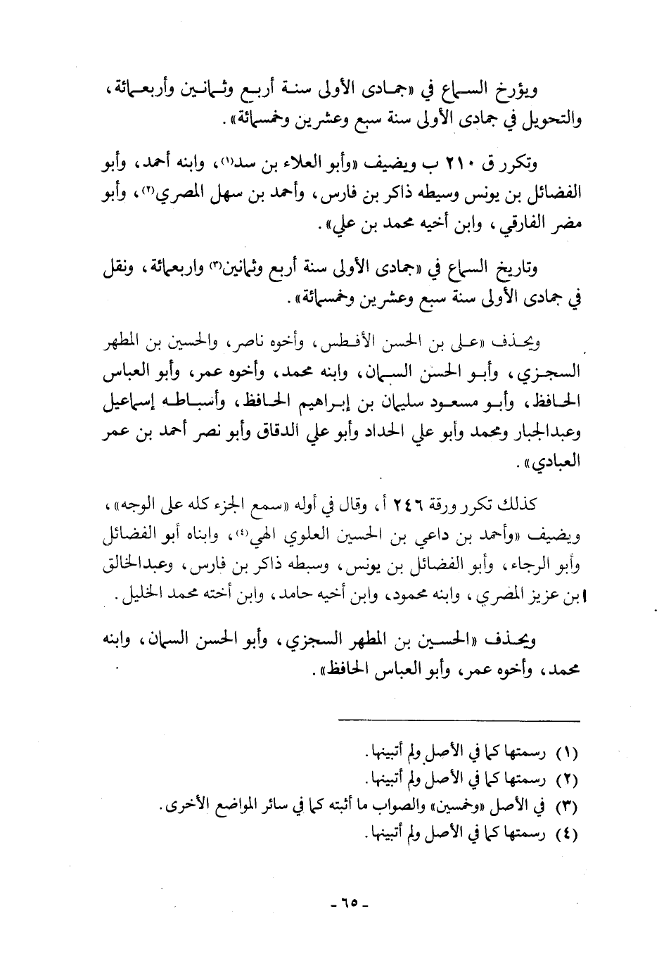 ويحذف «علي بن الحسن الأفطس، وأخوه ناصر، والحسين بن المطهر السجزيّ، وابو الحسن السمان، وابنه محمد، واخوه عمر، وابو العباس الحافظ، وابو مسعود سليمان بن إبراهيم الحافظ، وأسباطه إسماعيل وعبد الجبار ومحمد وابو علي الحداد وابو علي الدقاق وابو نصر أحمد بن عمر العبادي» .