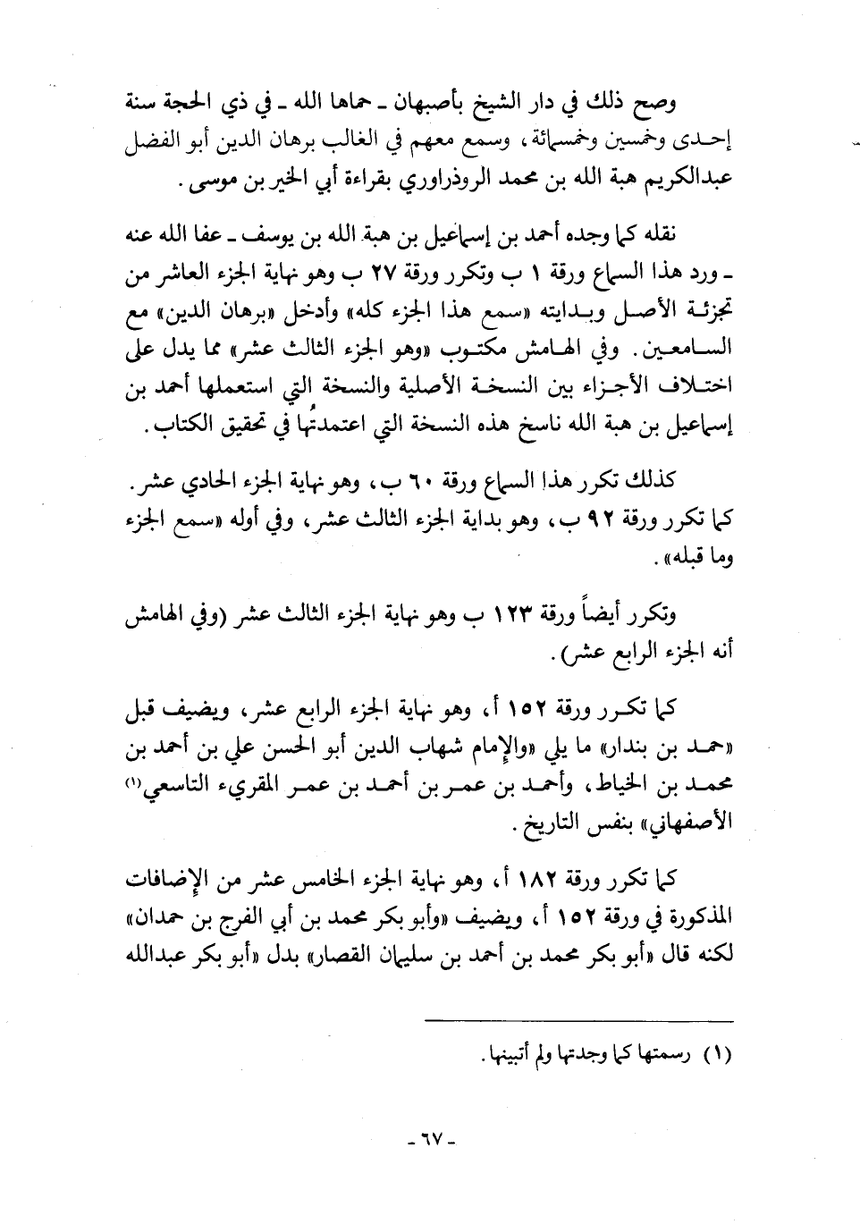 كما تكرر ورقة 152 أ، وهو نهاية الجزء الرابع عشر، ويضيف قبل «حمد بن بندار» ما يلي «والامام شهاب الدين أبو الحسن علي بن أحمد ابن محمد بن الخياط، وأحمد بن عمر بن أحمد بن عمر المقرئ الباسعى [1] الأصفهانيّ» بنفس التاريخ.
