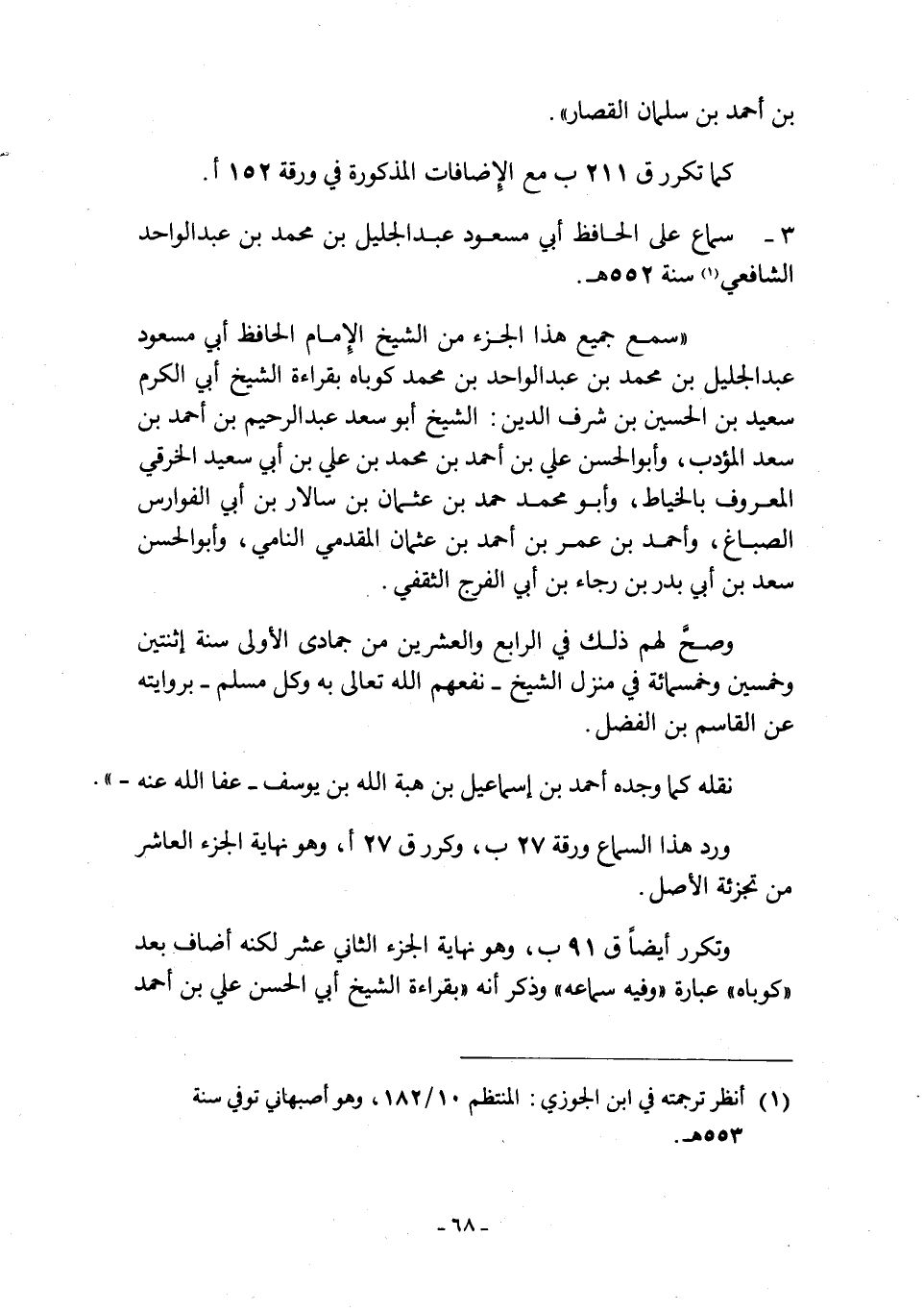 3- سماع على الحافظ أبي مسعود عبد الجليل بن محمد بن عبد الواحد الشافعيّ [1] سنة 552 هـ.
