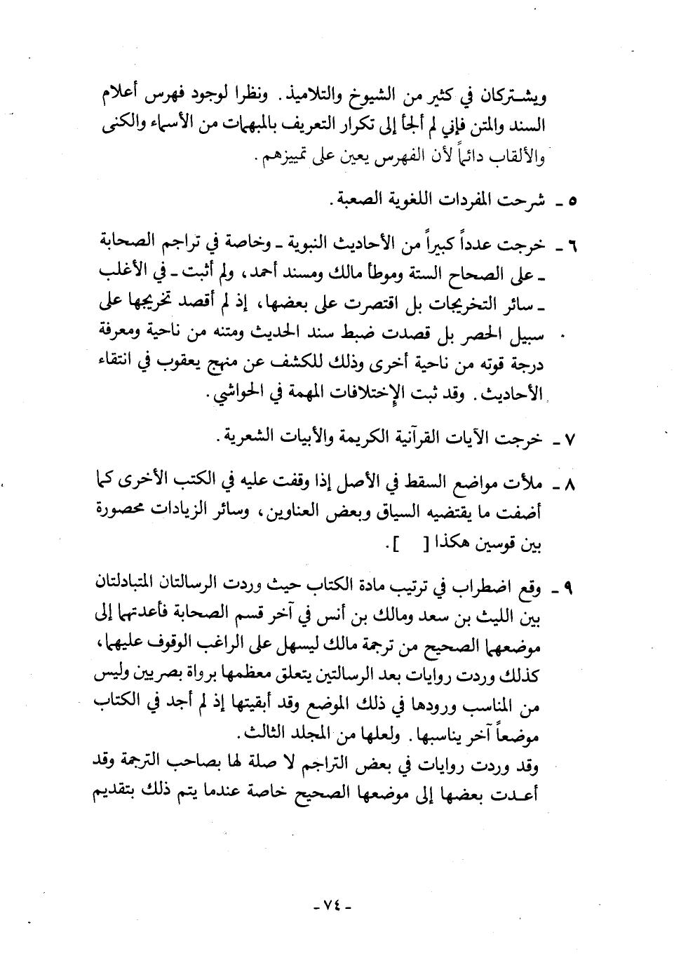9- وقع اضطراب في ترتيب مادة الكتاب حيث وردت الرسالتان المتبادلتان بين الليث بن سعد ومالك بن انس في آخر قسم الصحابة فأعدتهما الى موضعهما الصحيح من ترجمة مالك ليسهل على الراغب الوقوف عليهما، كذلك وردت روايات بعد الرسالتين يتعلق معظمها برواة بصريين وليس من المناسب ورودها في ذلك الموضع وقد أبقيتها إذ لم أجد في الكتاب موضعا آخر يناسبها. ولعلها من المجلد الثالث.