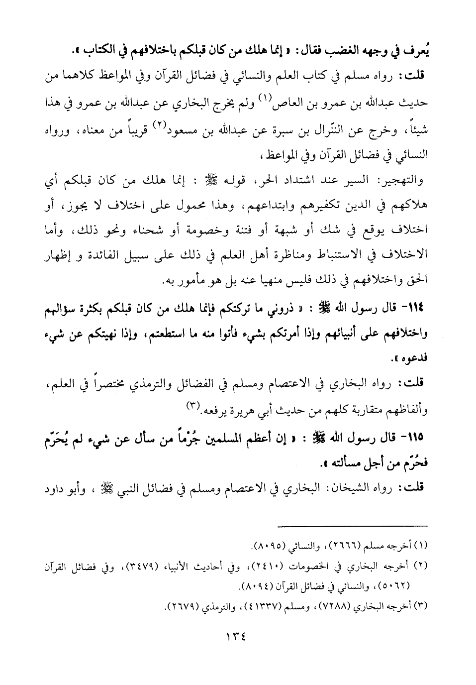 114 - قال رسول الله - صلى الله عليه وسلم -: "ذروني ما تركتكم فإنما هلك من كان قبلكم بكثرة سؤالهم واختلافهم على أنبيائهم وإذا أمرتكم بشيء فأتوا منه ما استطعتم، وإذا نهيتكم عن شيء فدعوه".