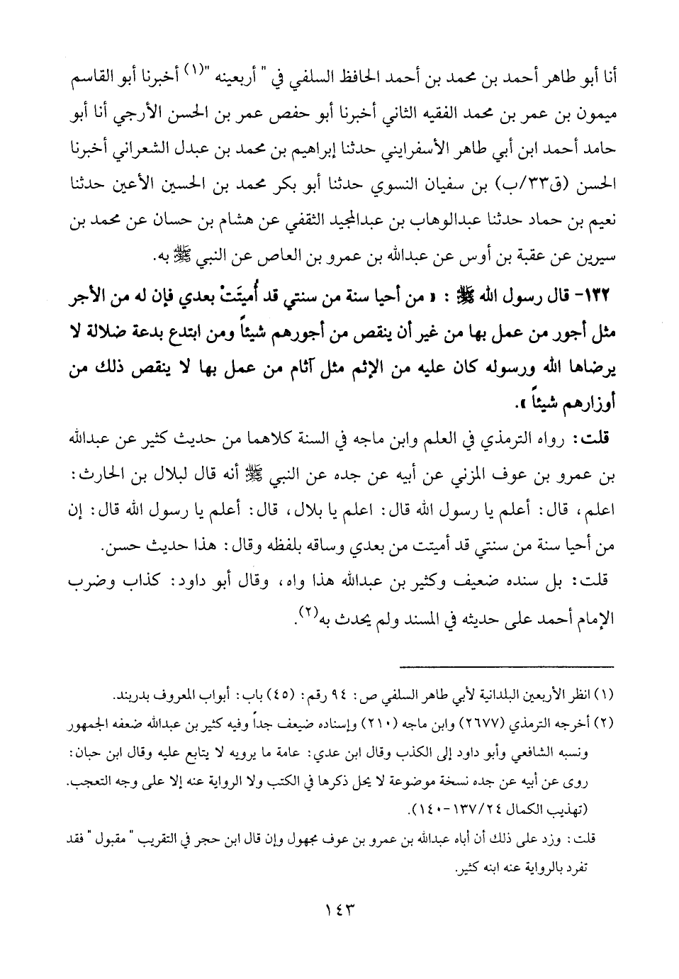 132 - قال رسول الله - صلى الله عليه وسلم -: "من أحيا سنة من سنتي قد أُميتَتْ بعدي فإن له من الأجر مثل أجور من عمل بها من غير أن ينقص من أجورهم شيئًا ومن ابتدع بدعة ضلالة لا يرضاها الله ورسوله كان عليه من الإثم مثل آثام من عمل بها لا ينقص ذلك من أوزارهم شيئًا".