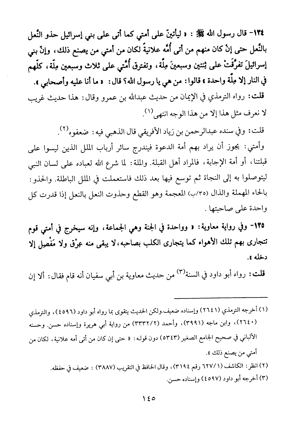 134 - قال رسول الله - صلى الله عليه وسلم -: "ليأتينّ على أمتي كما أتى على بني إسرائيل حذو النَّعل بالنَّعل حتى إن كان منهم من أتى أُمَّه علانيةً لكان من أمتي من يصنع ذلك، وإنّ بني إسرائيلَ تفرَّقَتْ على ثِنتين وسبعينَ مِلَّة، وتفترق أُمَّتي على ثلاث وسبعين مِلّة، كلّهم في النار إلا مِلَّة واحدة" قالوا: من هي يا رسول الله؟ قال: "ما أنا عليه وأصحابي".