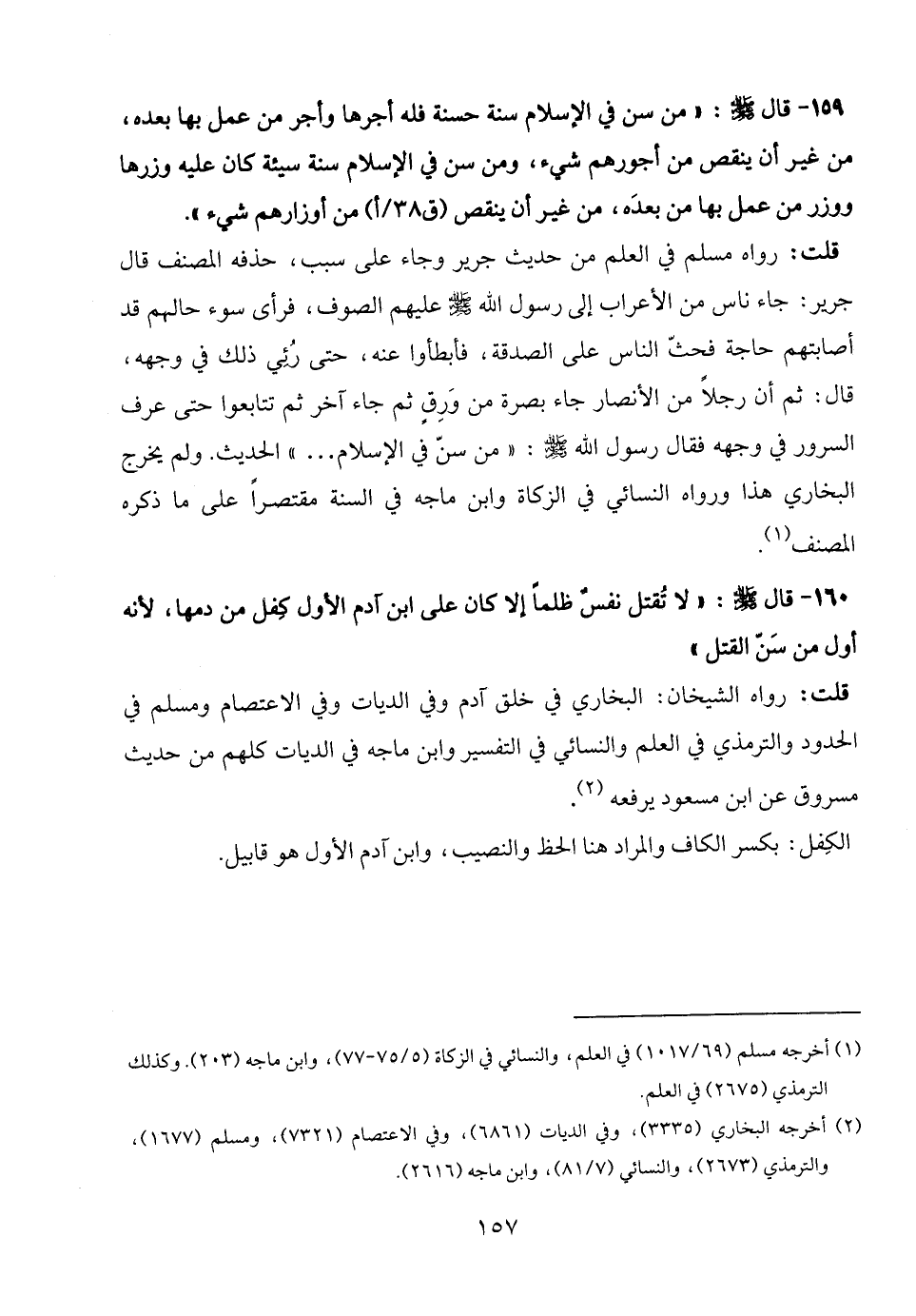 159 - قال - صلى الله عليه وسلم -: "من سن في الإسلام سنة حسنة فله أجرها وأجر من عمل بها بعده، من غير أن ينقص من أجورهم شيء، ومن سن في الإسلام سنة سيئة كان عليه وزرها ووزر من عمل بها من بعدَه، من غير أن ينقص من أوزارهم شيء".